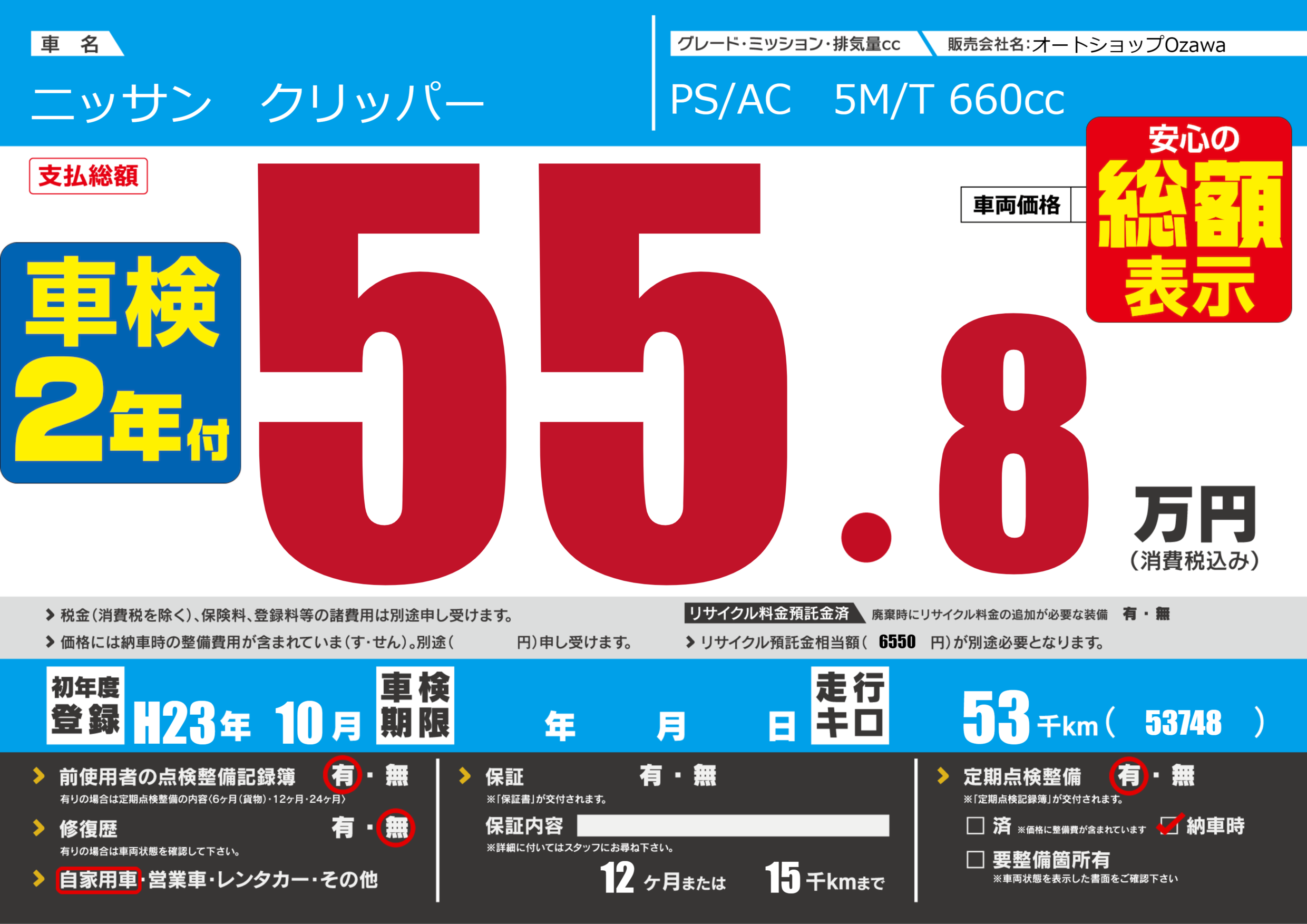 | 車名 | ニッサン クリッパー | グレード ミッション 排気量 |