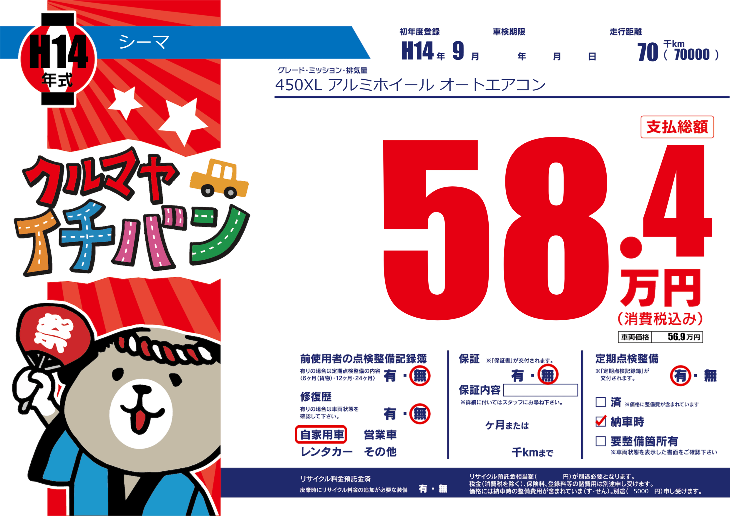 | 定期点検整備 | 定期点検整備あり 納車時あり | ||