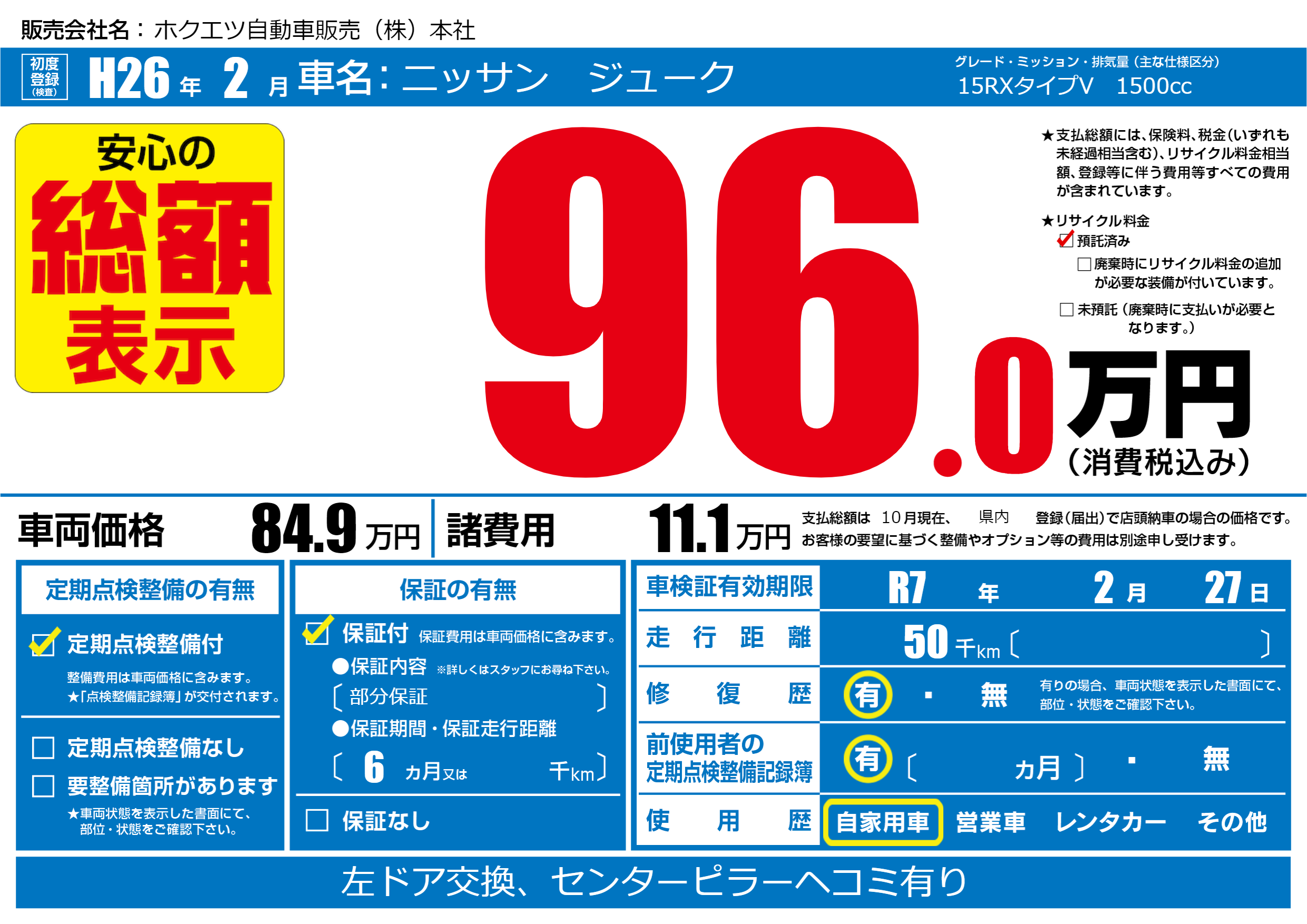 | 走行キロ | 5万km | 初年度登録 | H26年2月 |