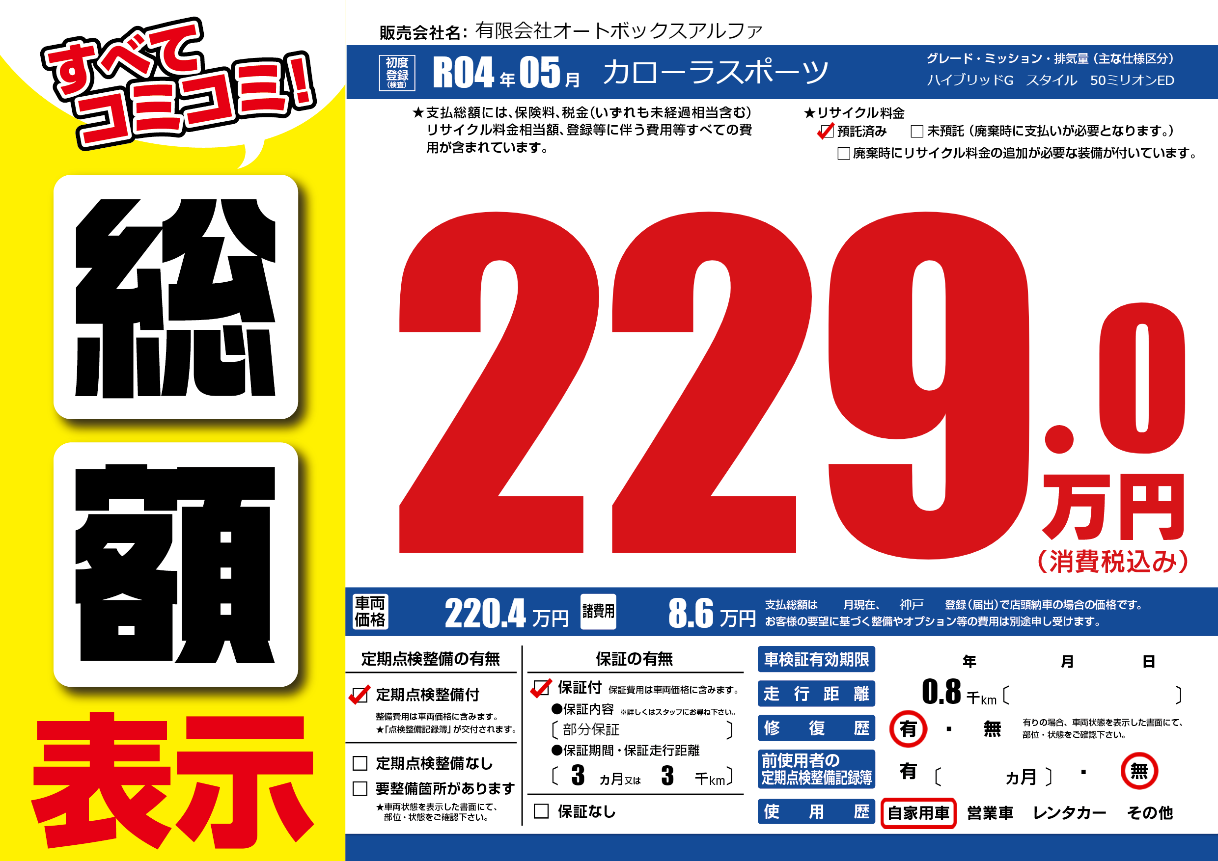 | 車名 | カローラスポーツ | グレード ミッション 排気量 |