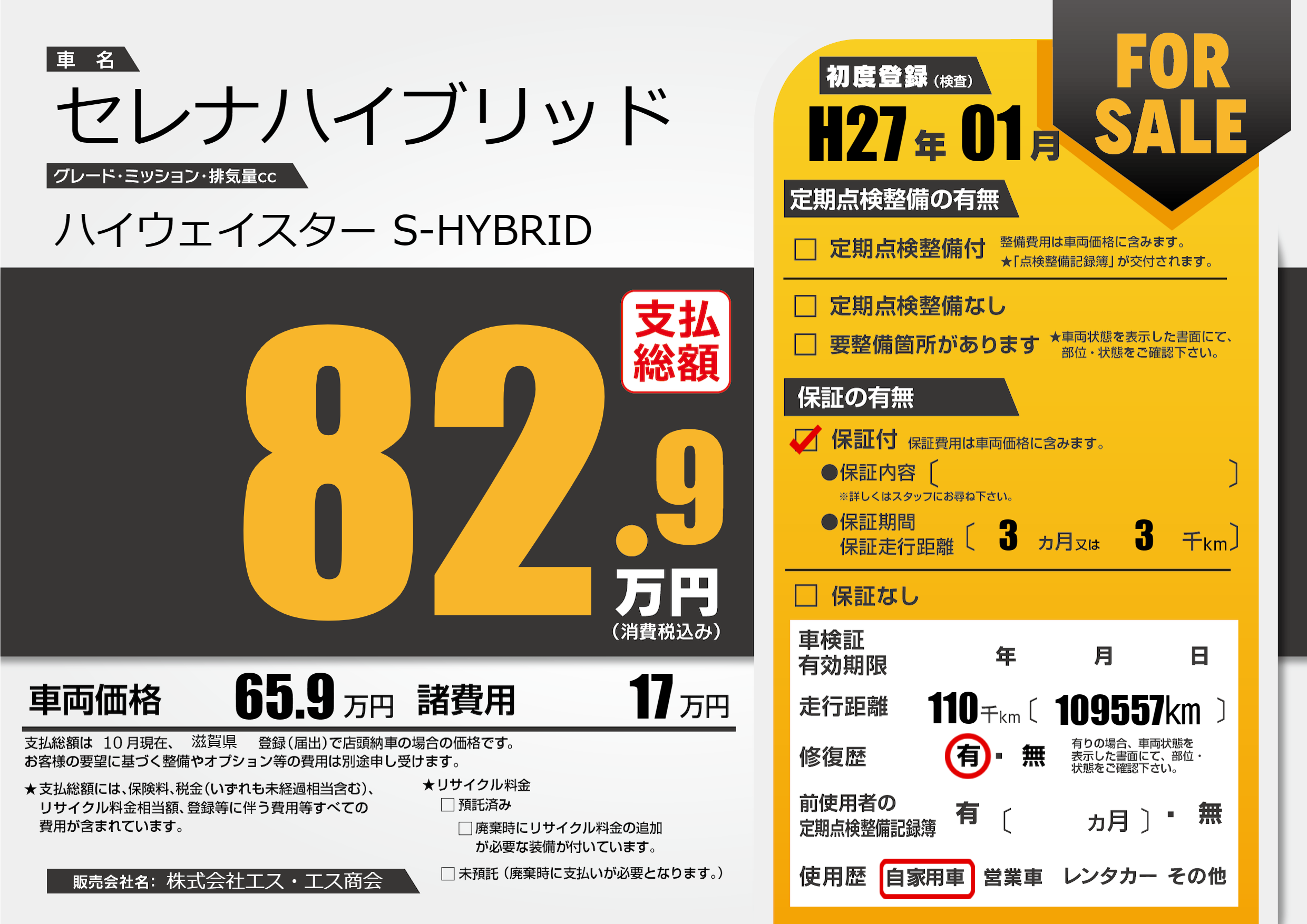| 走行キロ | 11万km | 初年度登録 | H27年01月 |