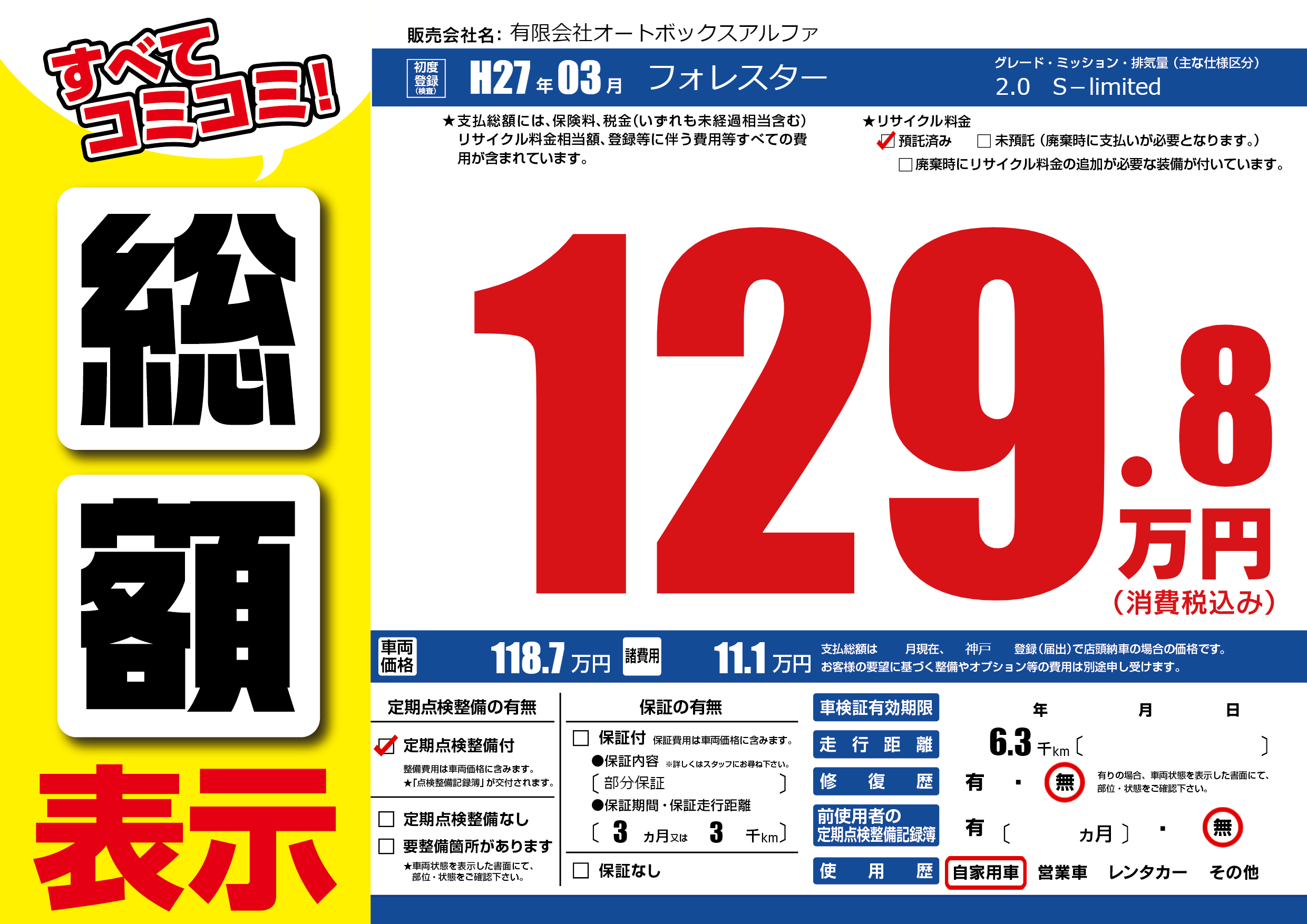 | 車名 | フォレスター | グレード ミッション 排気量 |