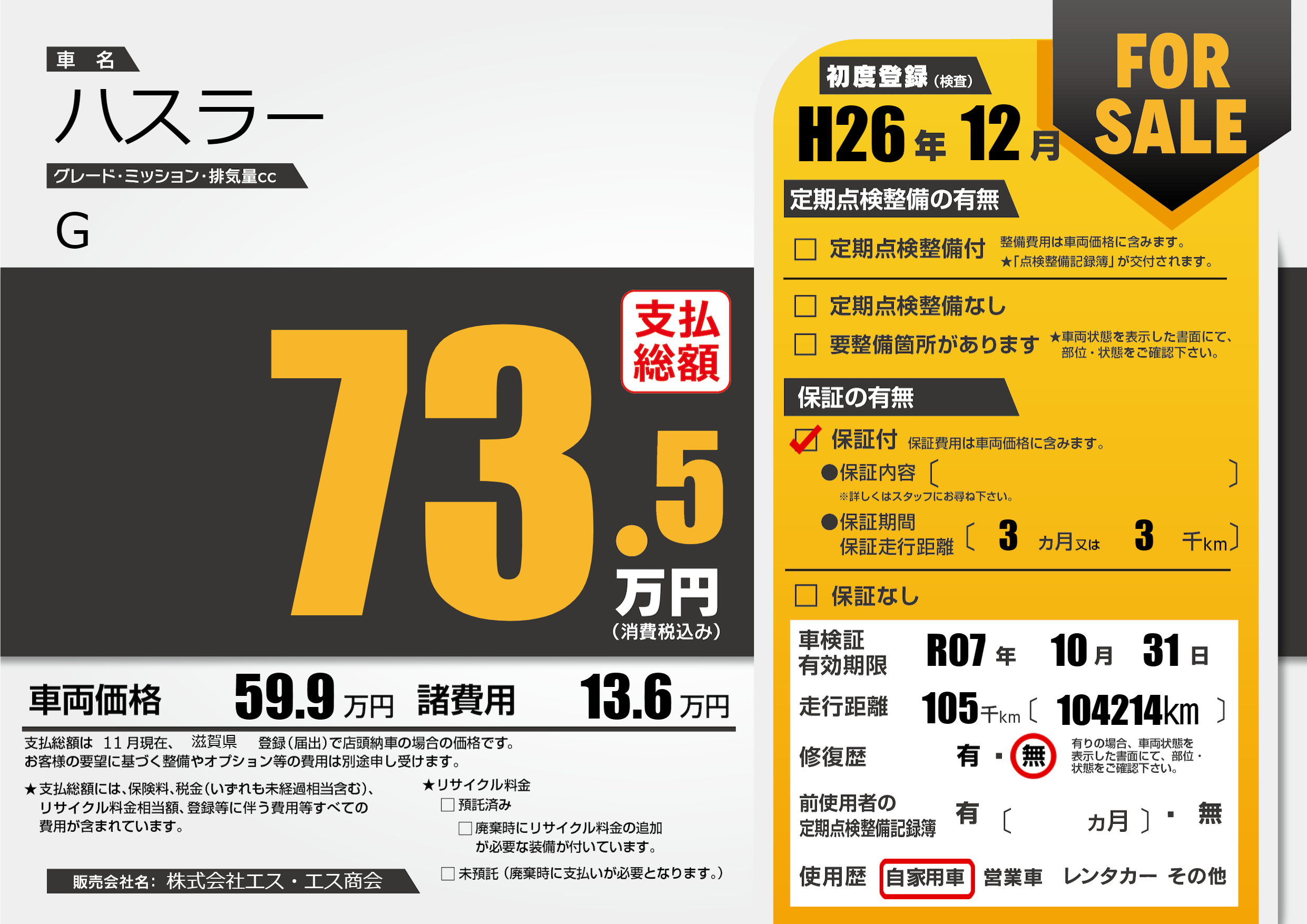 | 車名 | ハスラー | グレード ミッション 排気量 |