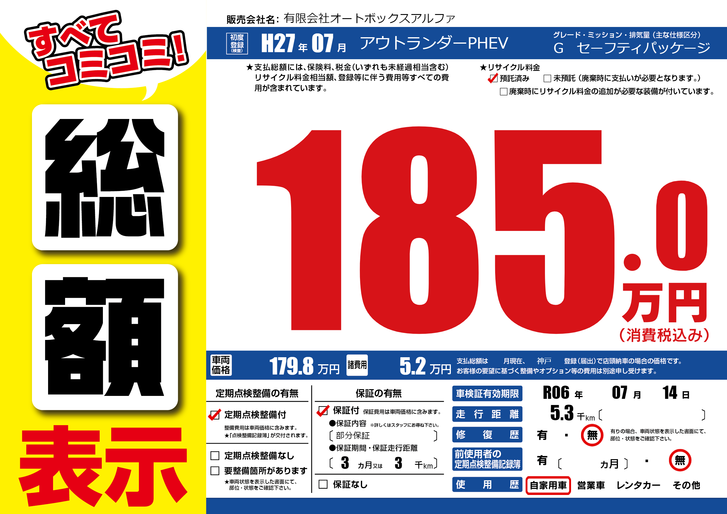 | 車名 | アウトランダーPHEV | グレード ミッション 排気量 |