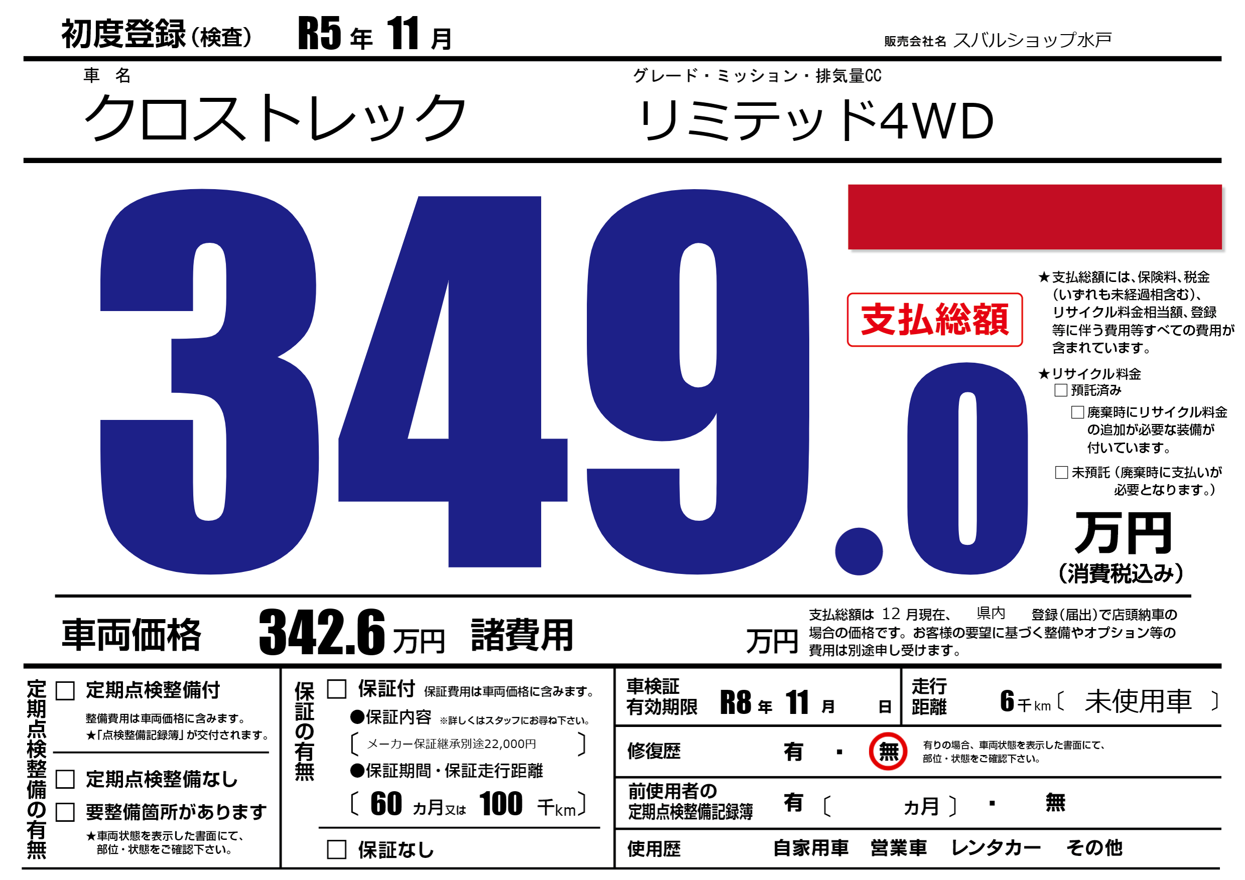 | 走行キロ | 0.6万km | 初年度登録 | R5年11月 |