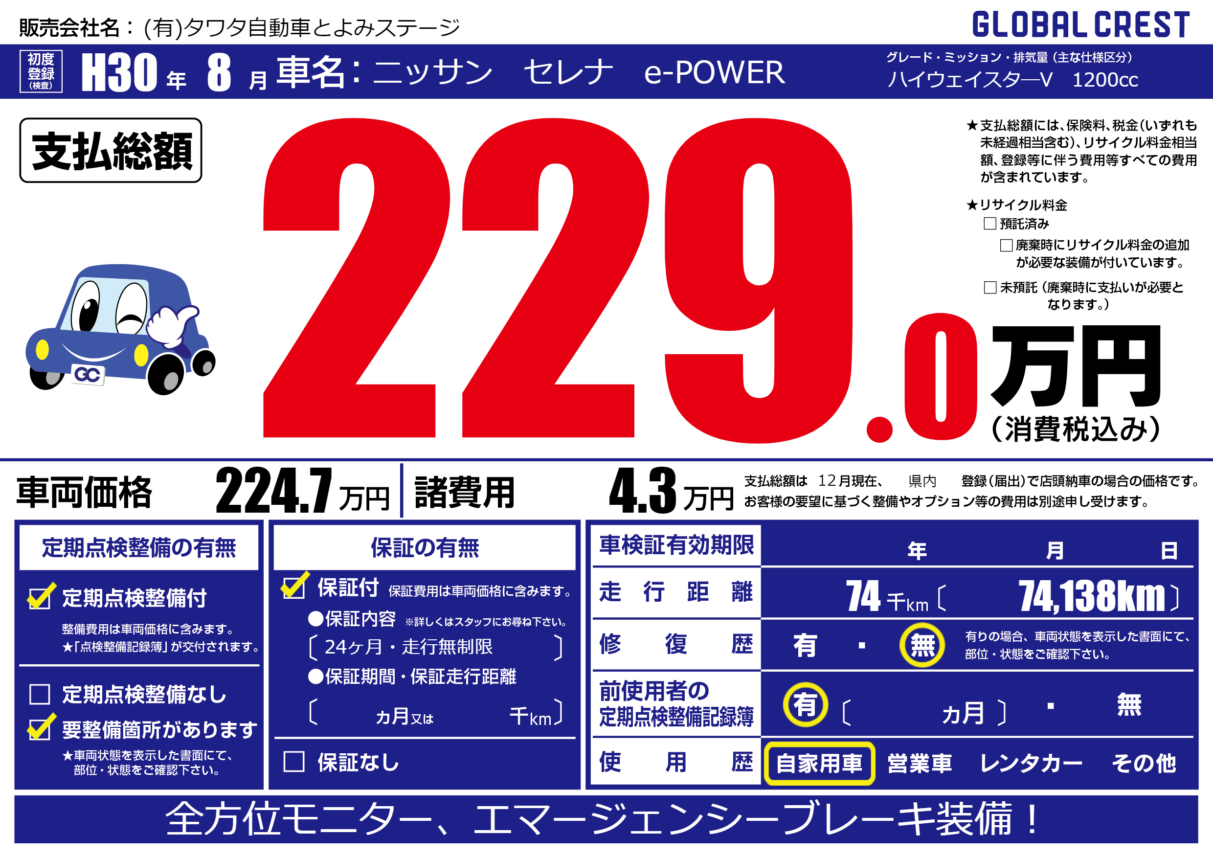| 車名 | ニッサン セレナ e-POWER | グレード ミッション 排気量 |