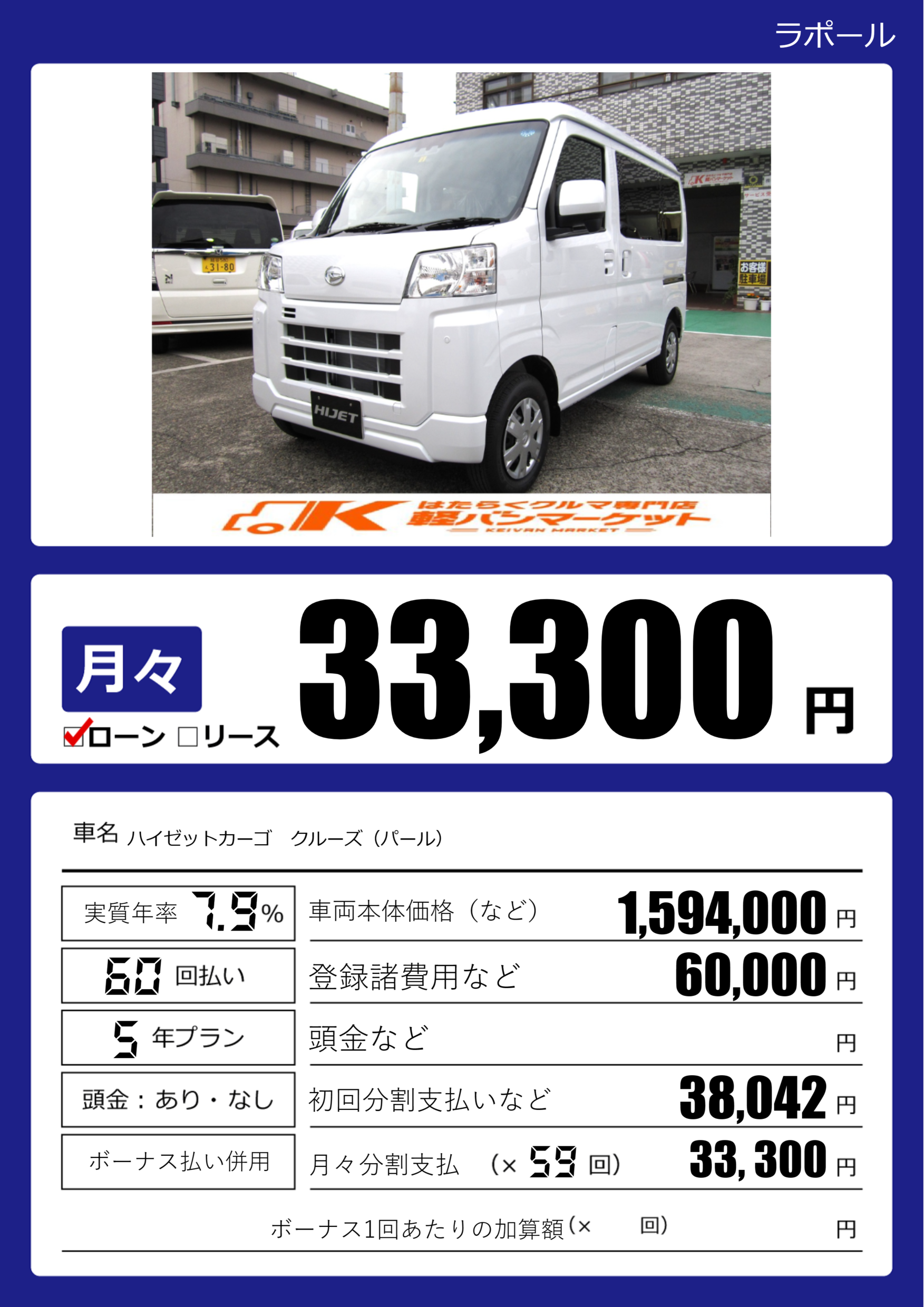 | 車名 | ハイゼットカーゴ クルーズ(パール) | グレード ミッション 排気量 |