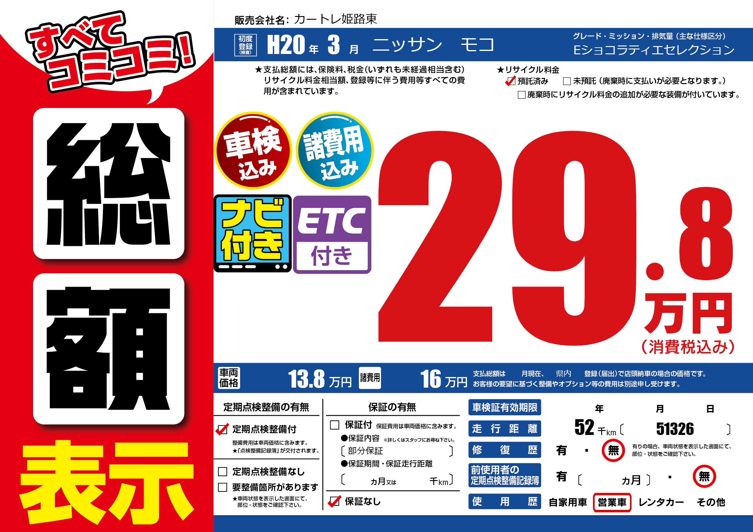 | 車名 | ニッサン モコ | グレード ミッション 排気量 |