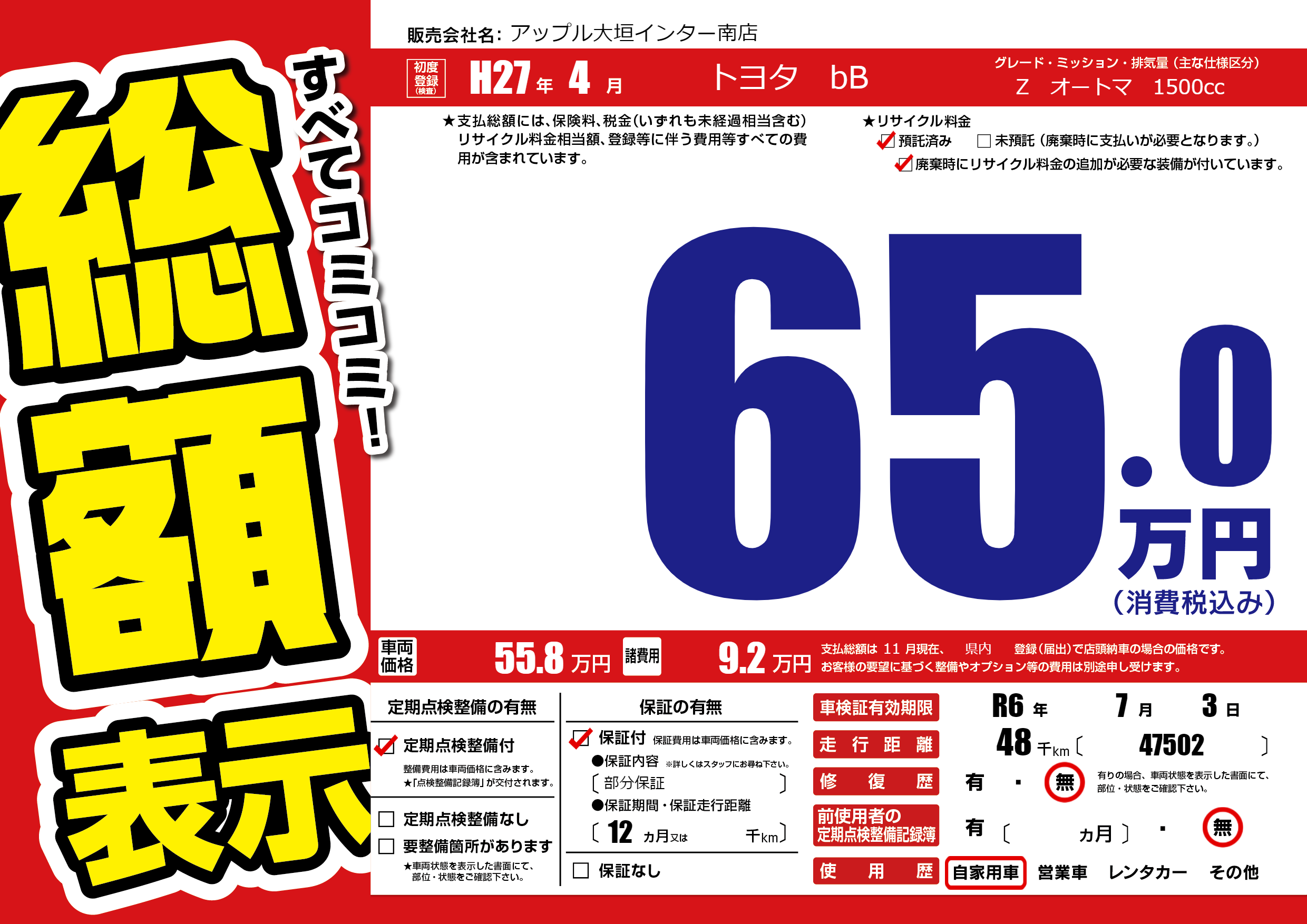 | 車名 | トヨタ bB | グレード ミッション 排気量 |