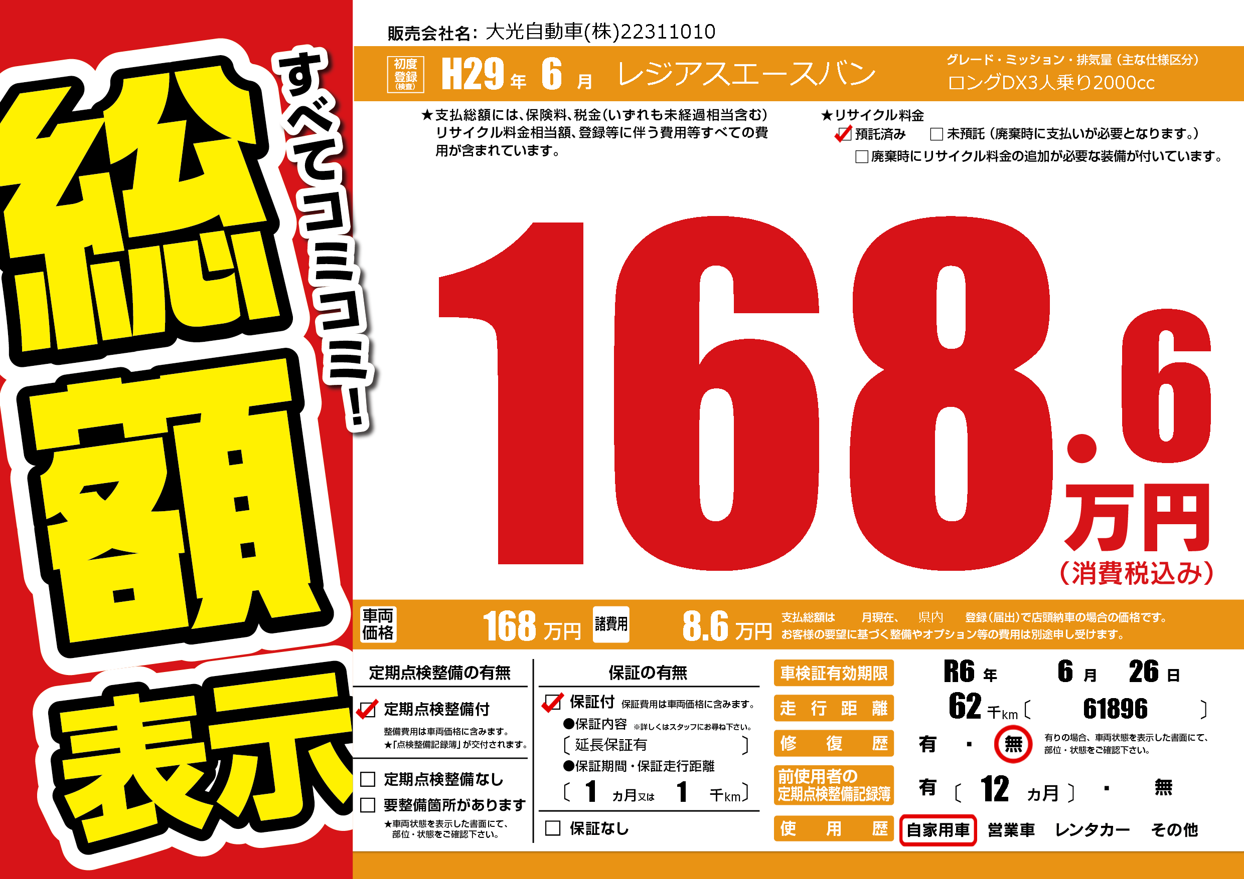 | 車名 | レジアスエースバン | グレード ミッション 排気量 |