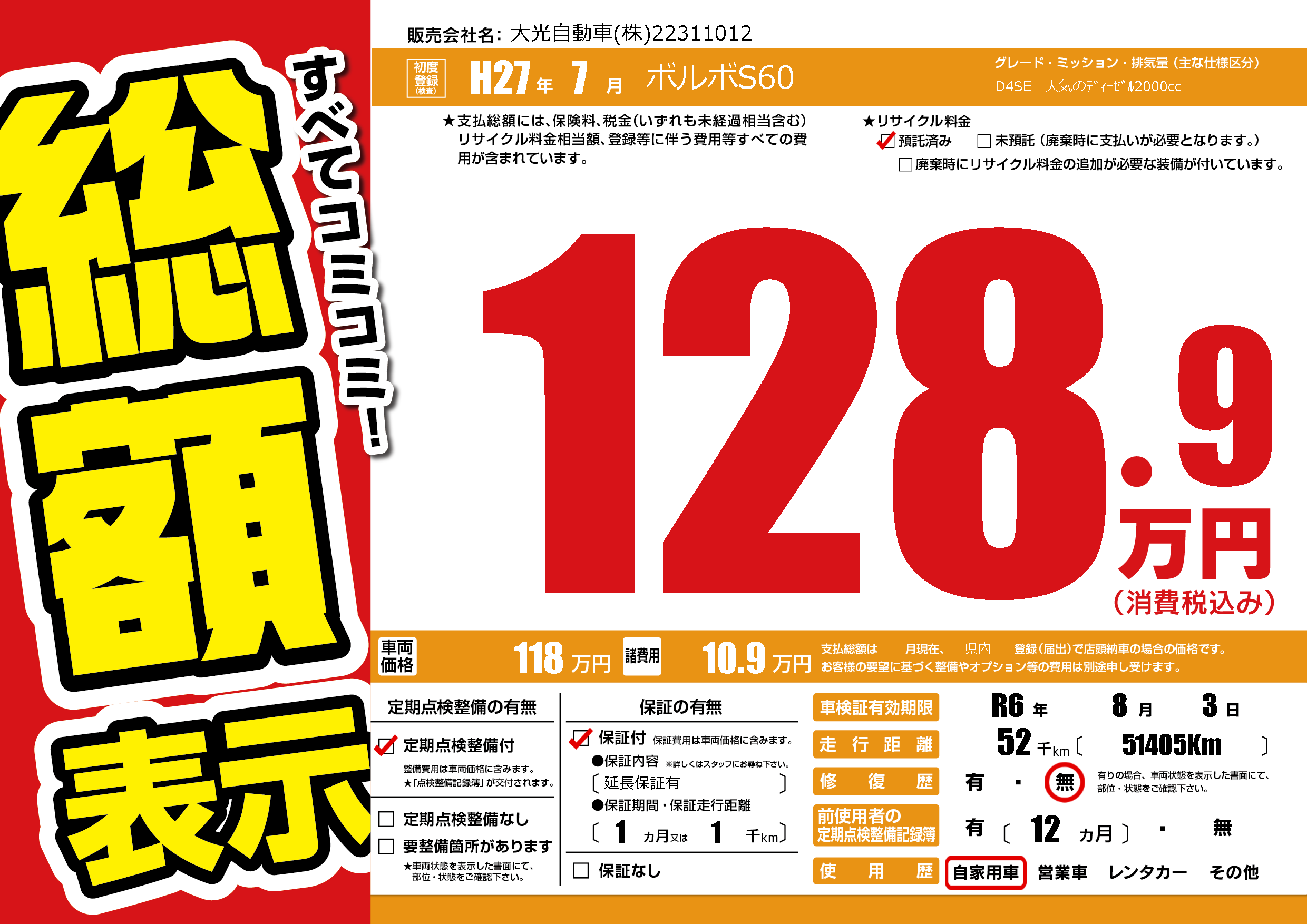 | 車名 | ボルボS60 | グレード ミッション 排気量 |
