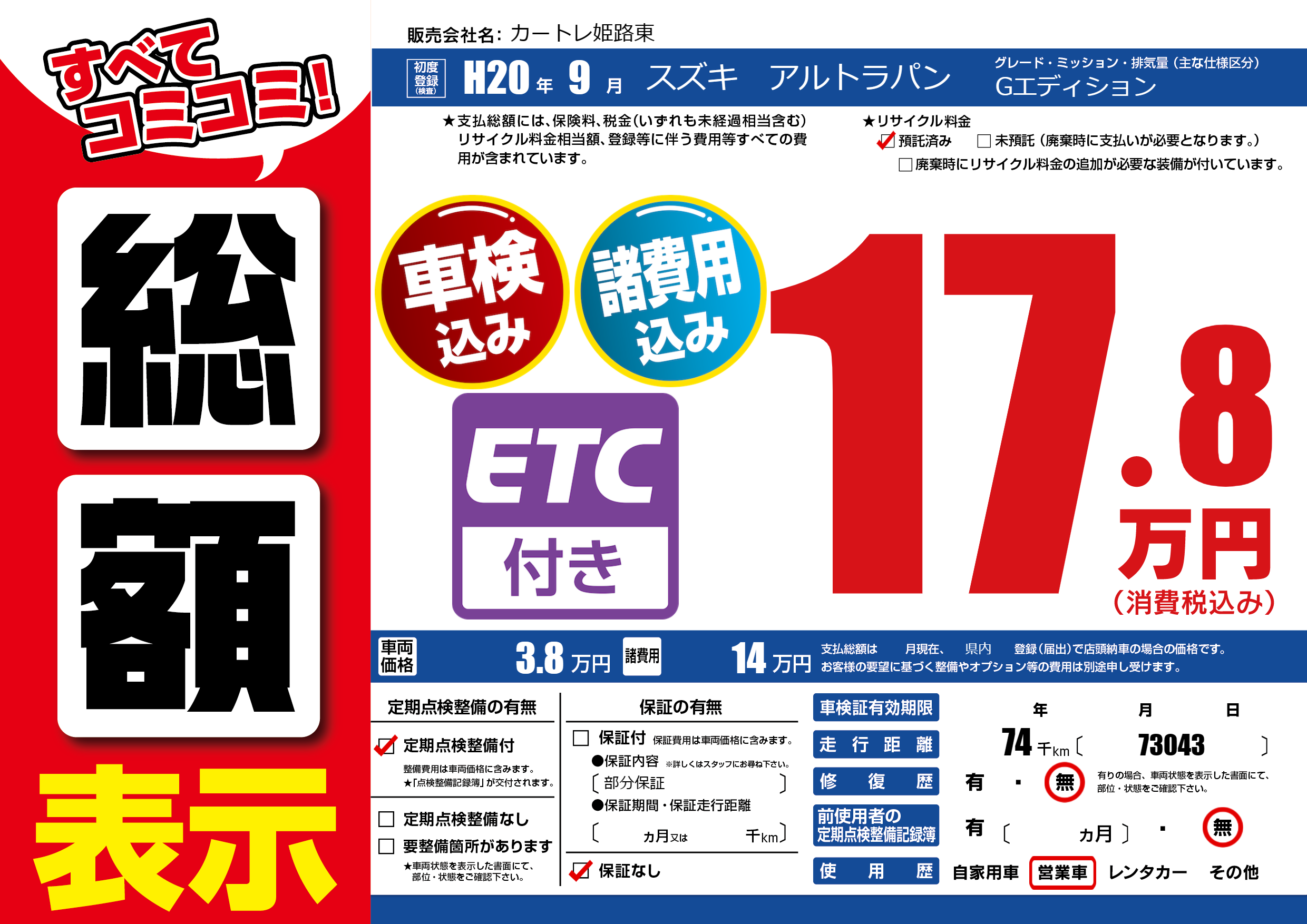 | 走行キロ | 7.4万km | 初年度登録 | H20年9月 |