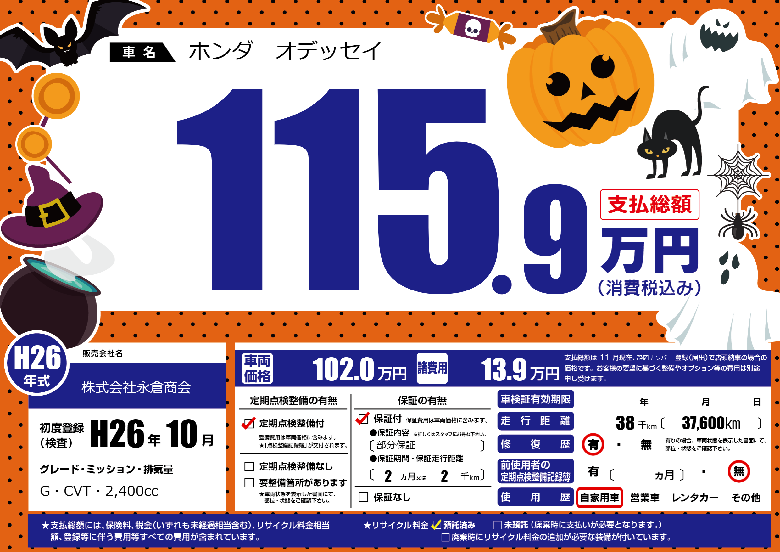 | 走行キロ | 3.8万km | 初年度登録 | H26年10月 |
