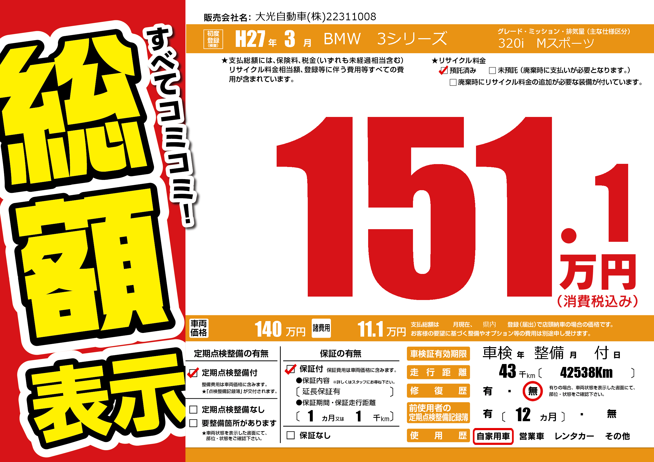 | 車名 | BMW 3シリーズ | グレード ミッション 排気量 |