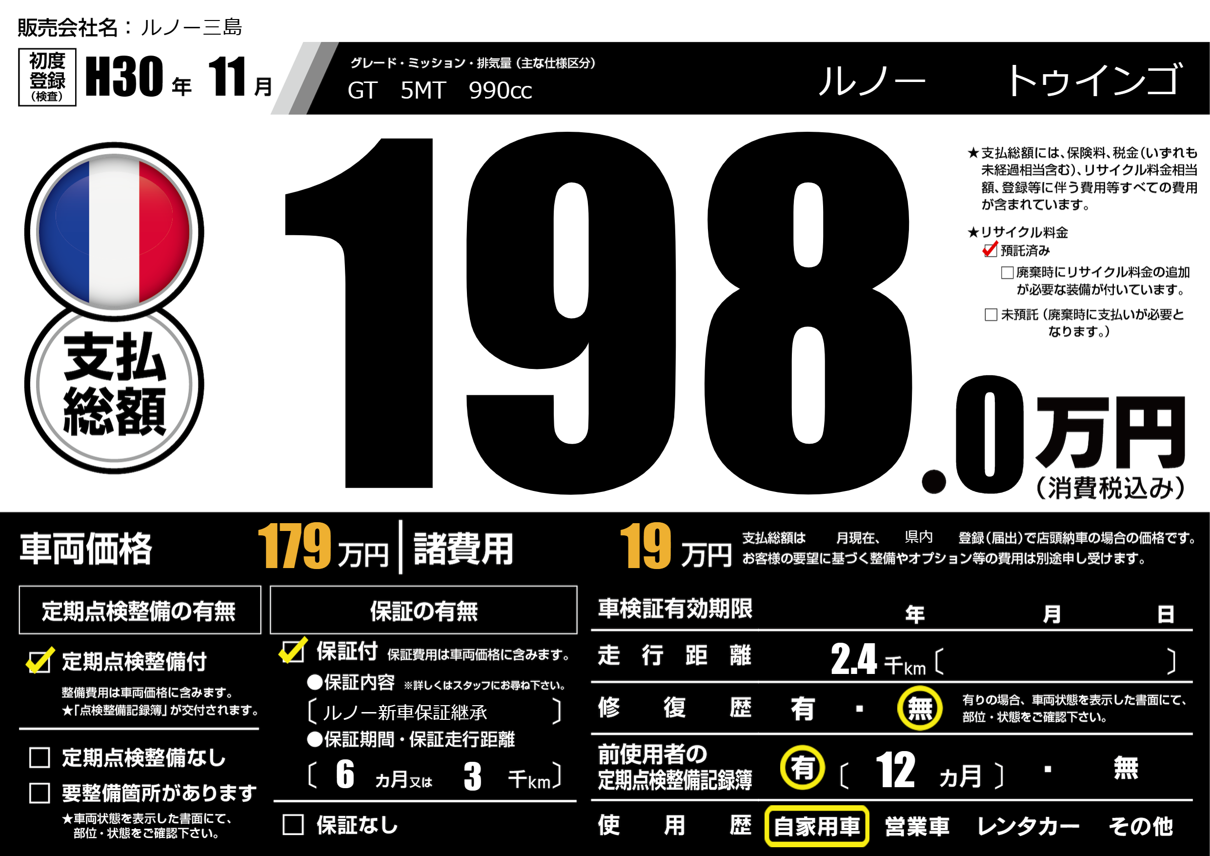 | 車名 | ルノー トゥインゴ | グレード ミッション 排気量 |