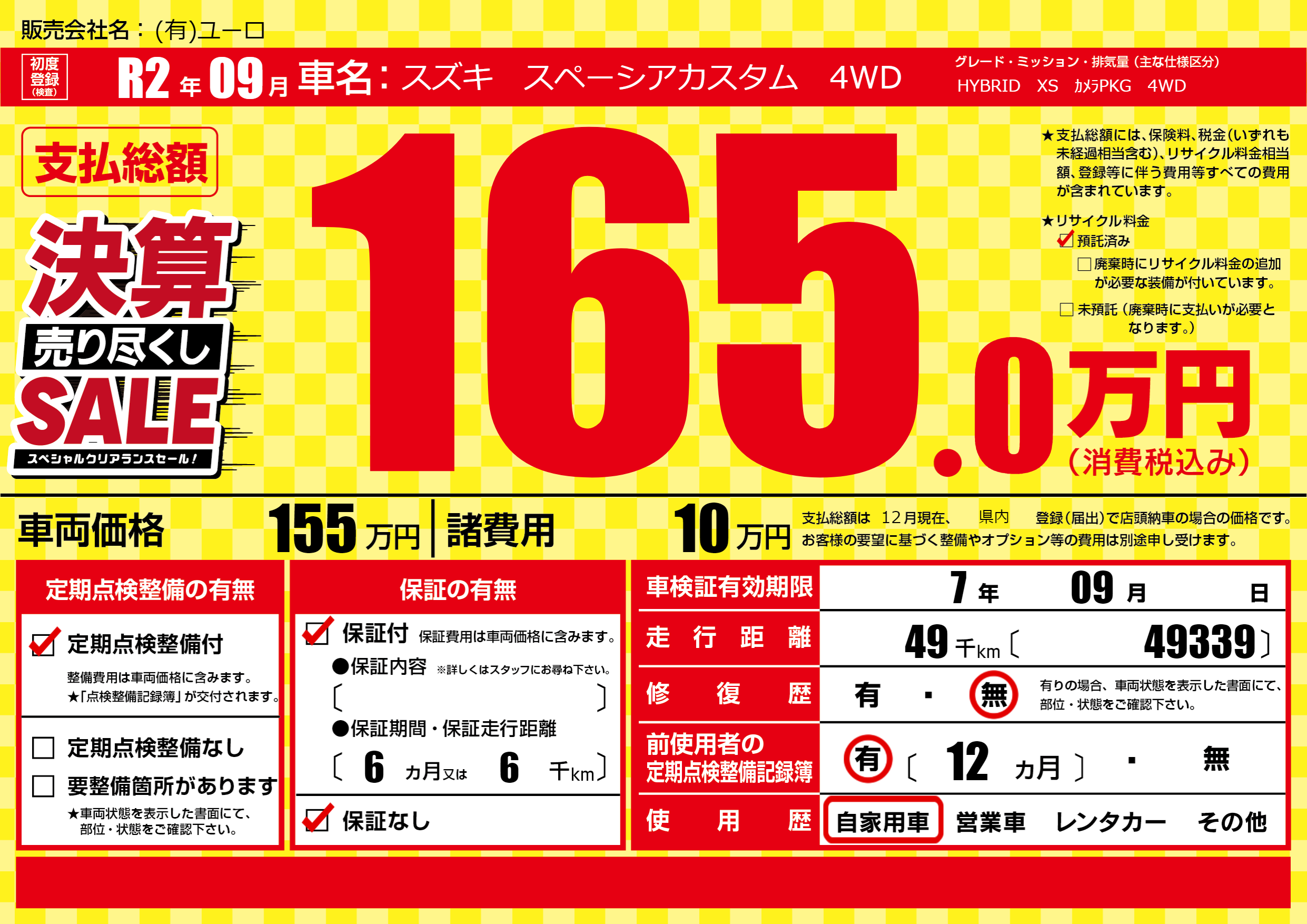 | 走行キロ | 4.9万km | 初年度登録 | R2年09月 |