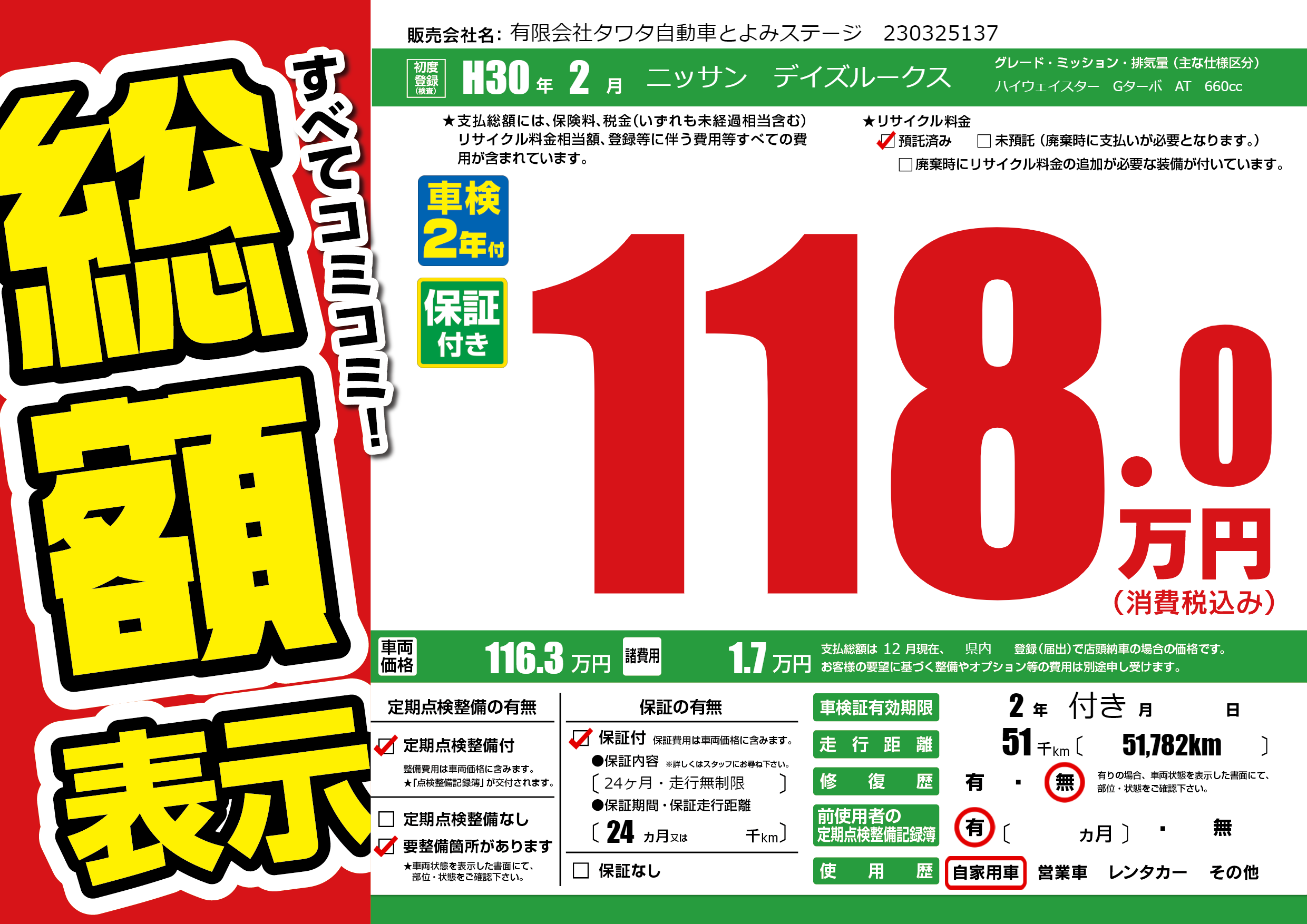 | 車名 | ニッサン デイズルークス | グレード ミッション 排気量 |