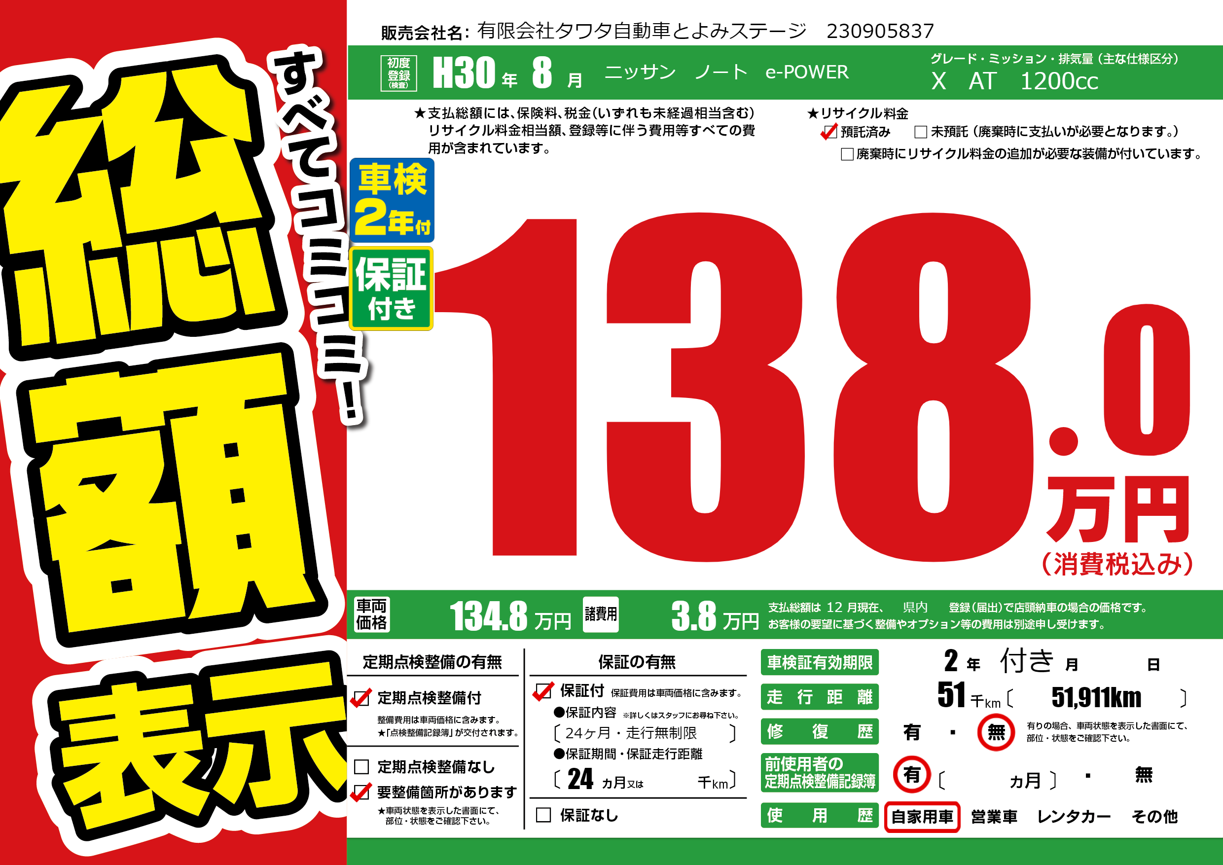 | 車名 | ニッサン ノート e-POWER | グレード ミッション 排気量 |