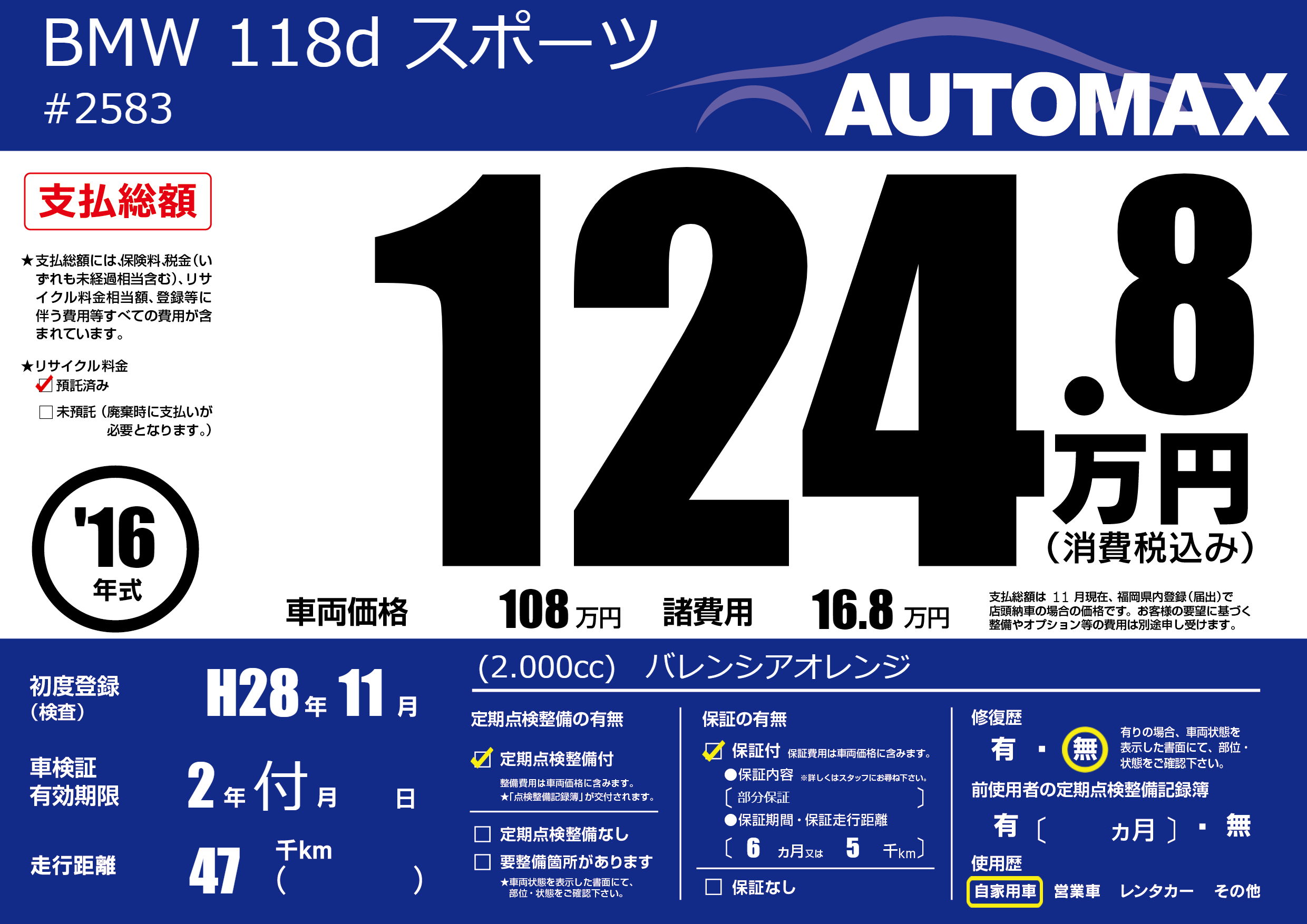 | 車名 | BMW 118d スポーツ | グレード ミッション 排気量 |