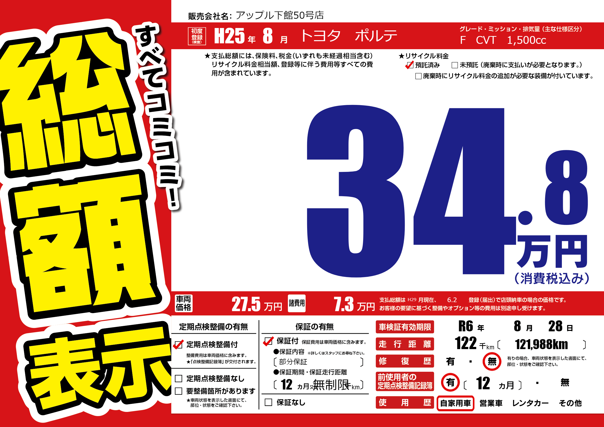 | 車名 | トヨタ ポルテ | グレード ミッション 排気量 |
