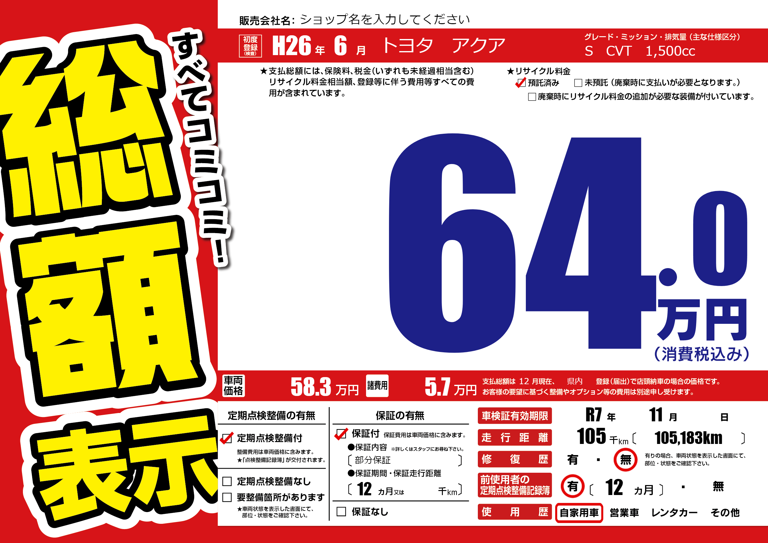 あり | リサイクル預託金相当額 | ( 0円)が別途必要 |