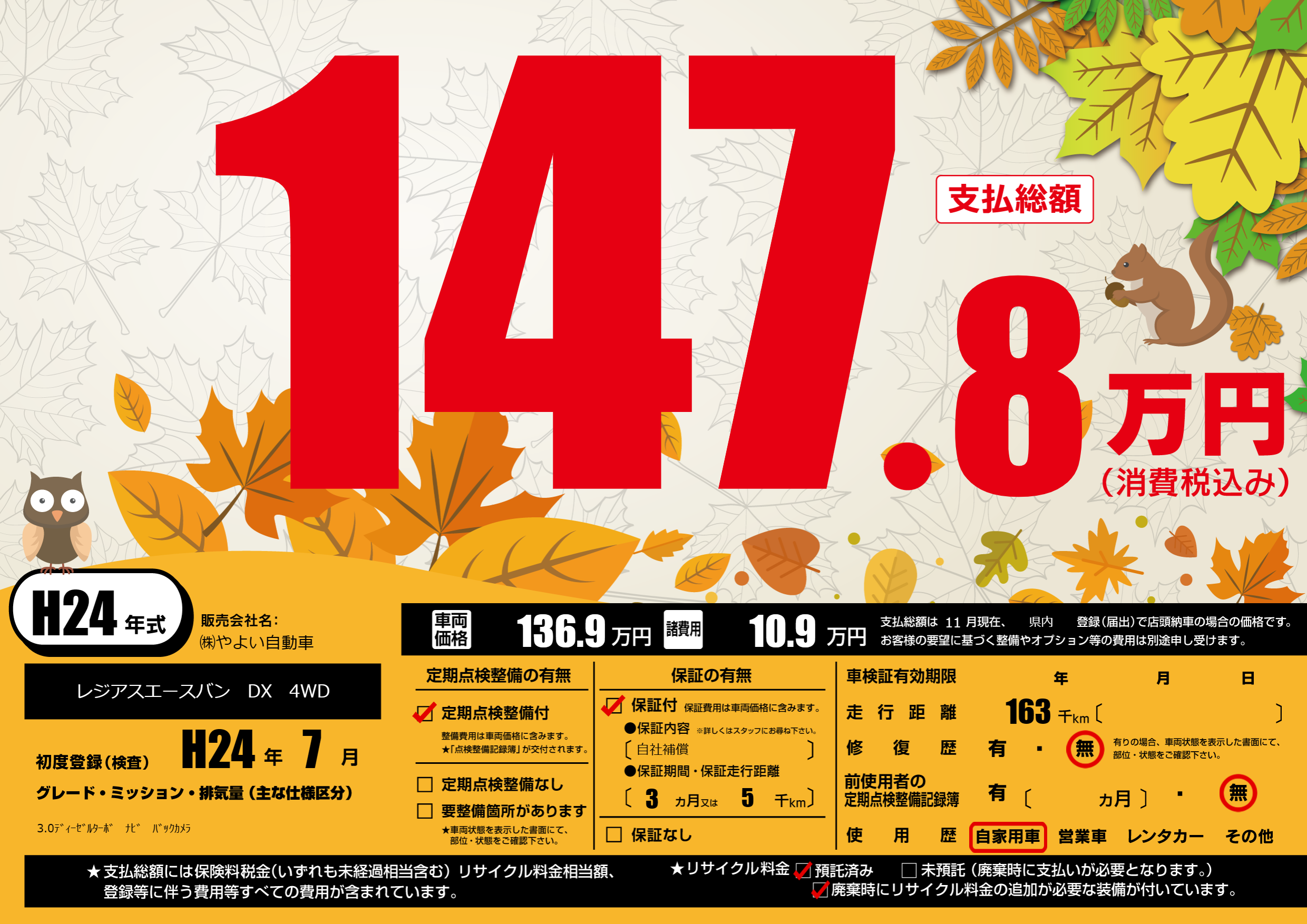 | 走行キロ | 16.3万km | 初年度登録 | H24年7月 |