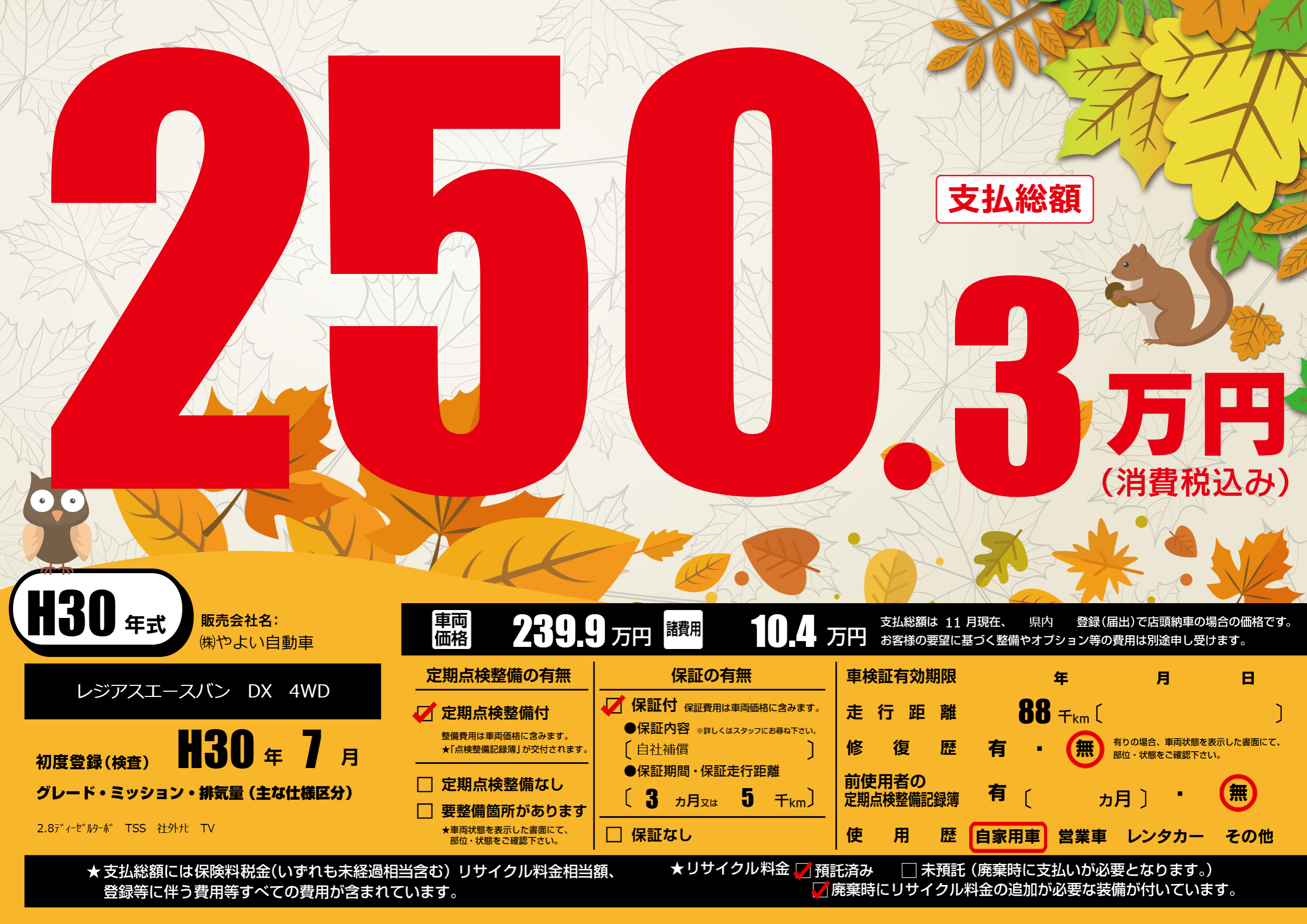 | 走行キロ | 8.8万km | 初年度登録 | H30年7月 |