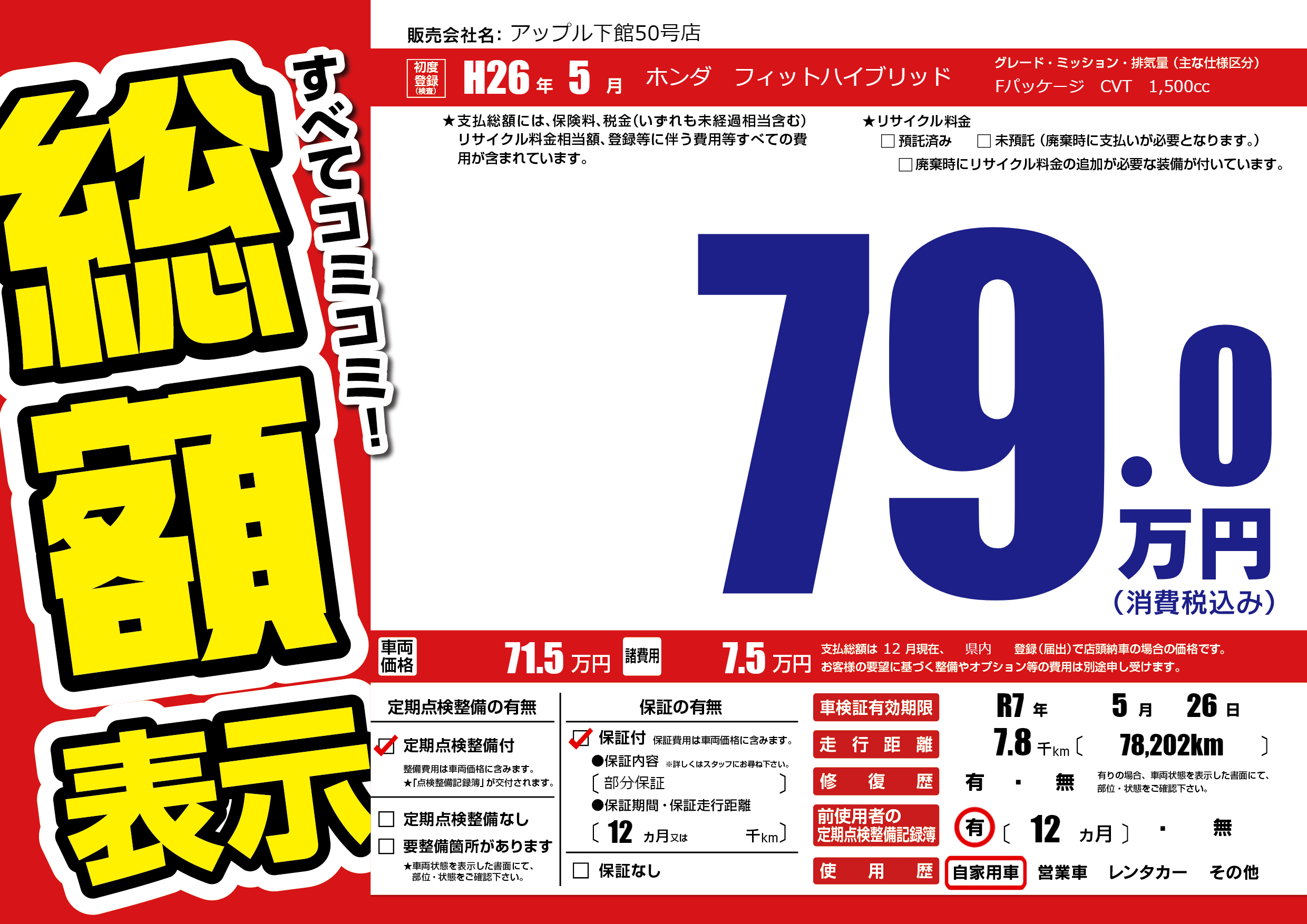 | 走行キロ | 0.7万km | 初年度登録 | H26年5月 |