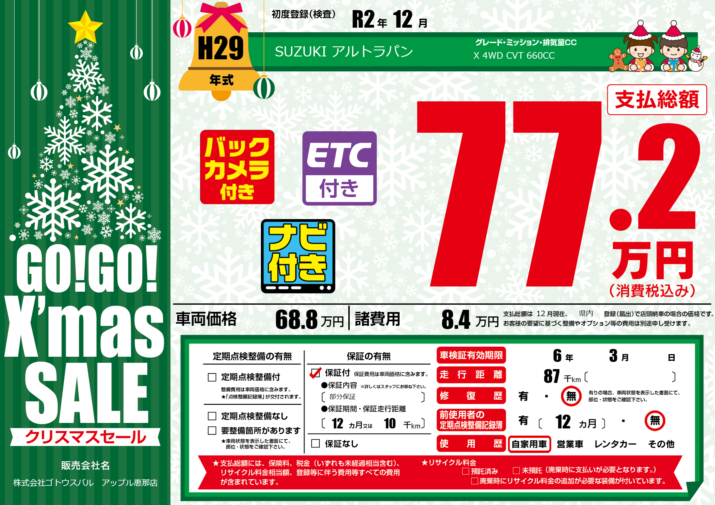 保証付き 保証内容(部分保証) 12ヶ月または(10)千kmまで |