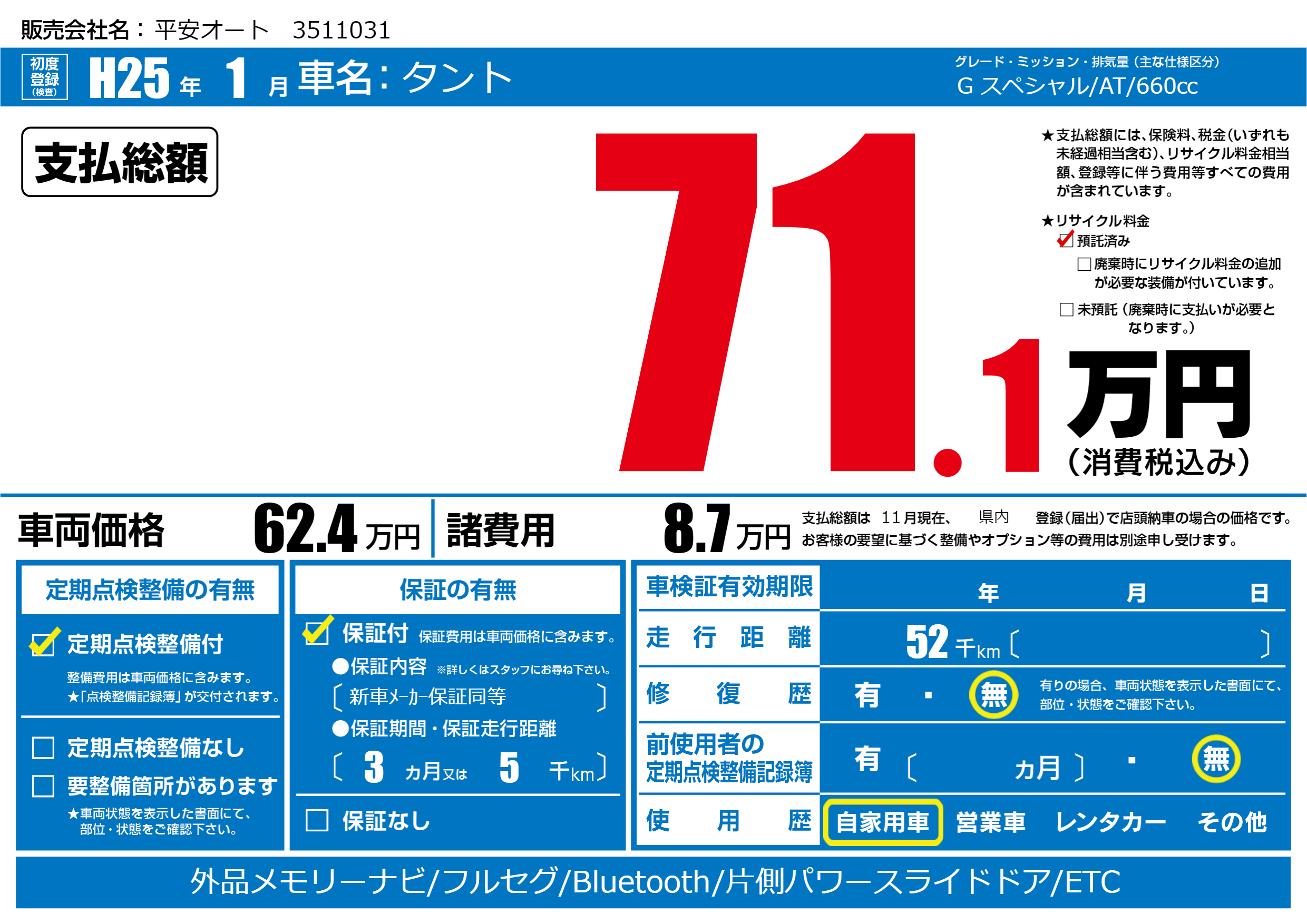 | 走行キロ | 5.2万km | 初年度登録 | H25年1月 |