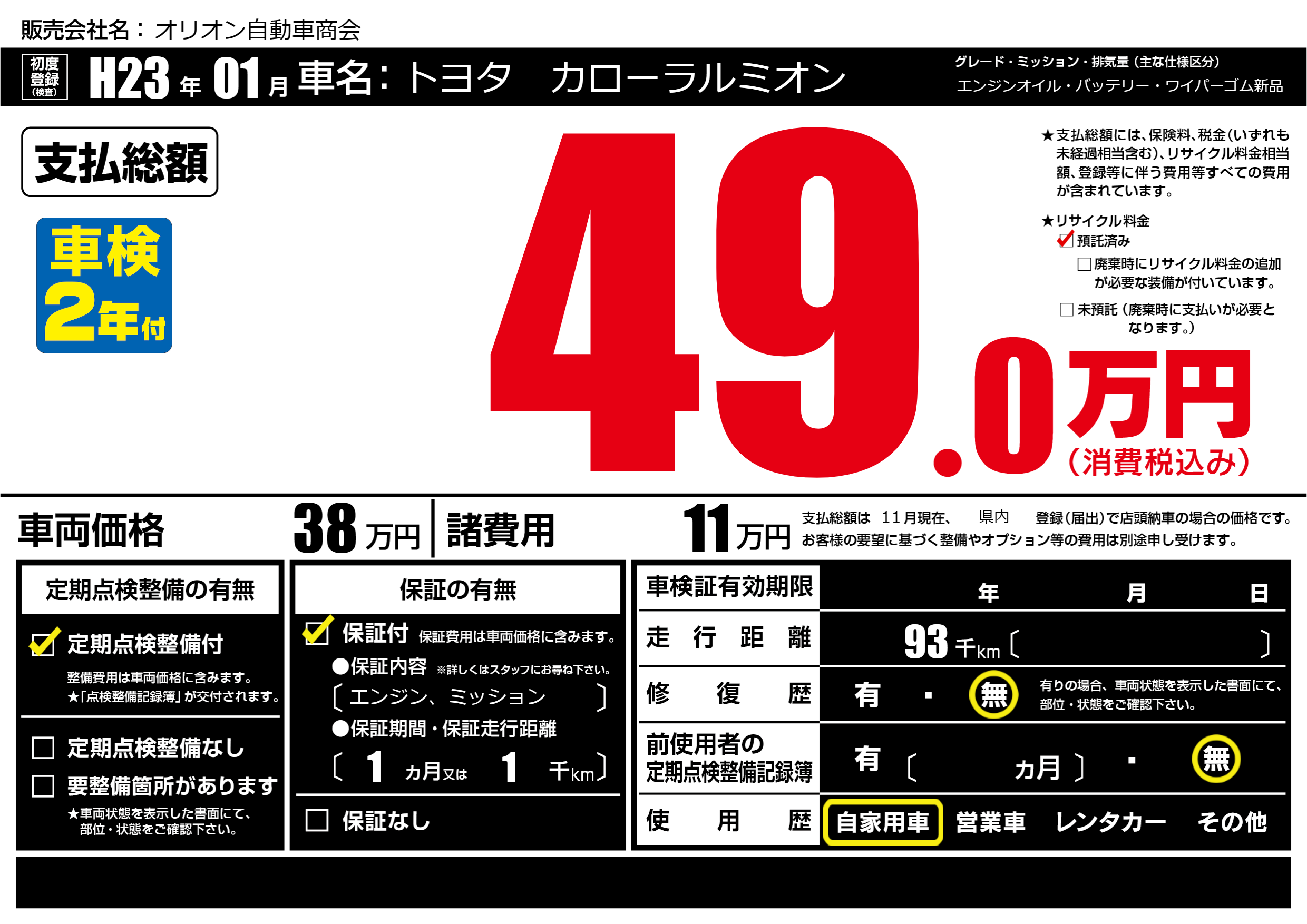| 走行キロ | 9.3万km | 初年度登録 | H23年01月 |