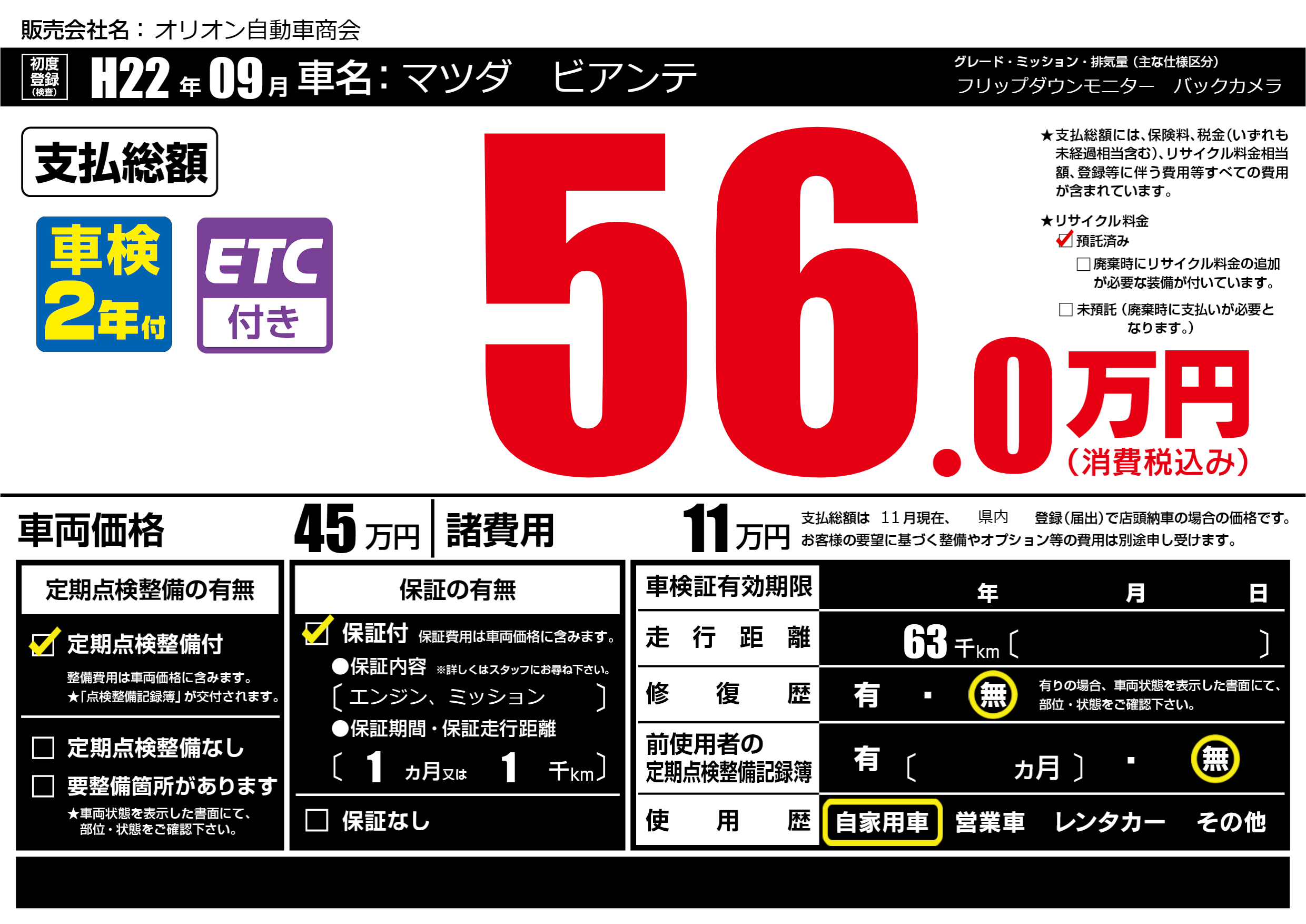 | 走行キロ | 6.3万km | 初年度登録 | H22年09月 |