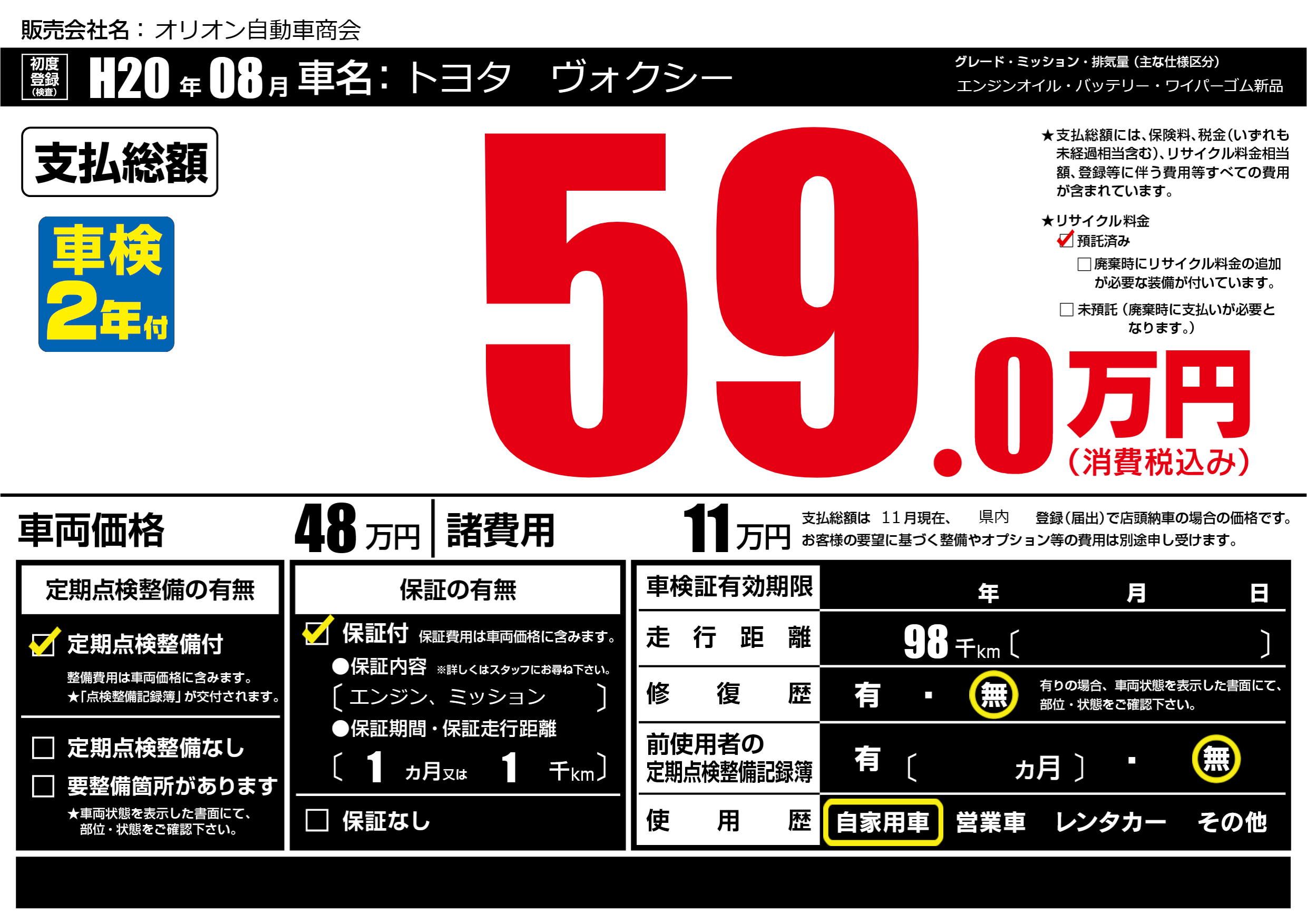 | 走行キロ | 9.8万km | 初年度登録 | H20年08月 |