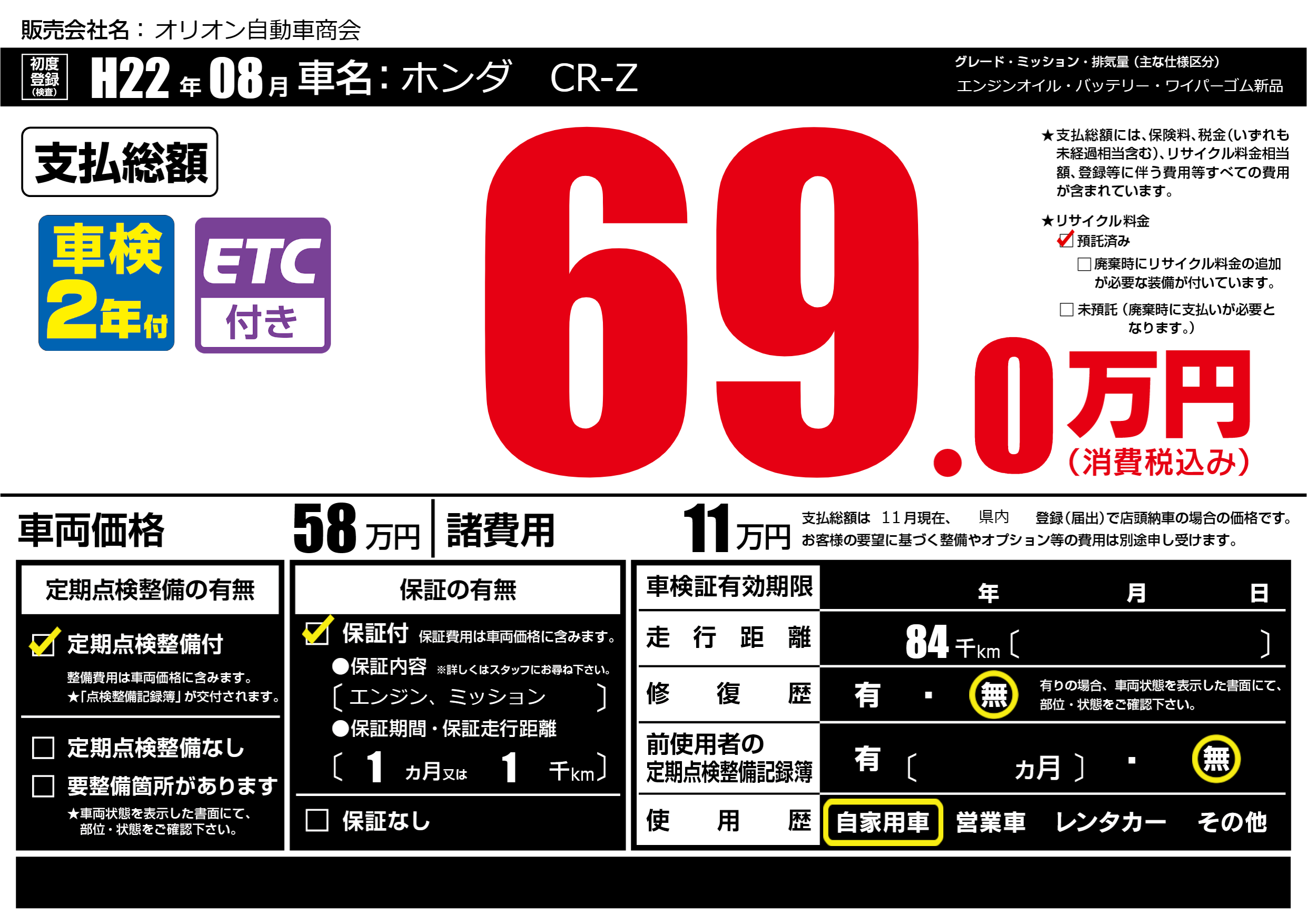 | 車名 | ホンダ CR-Z | グレード ミッション 排気量 |