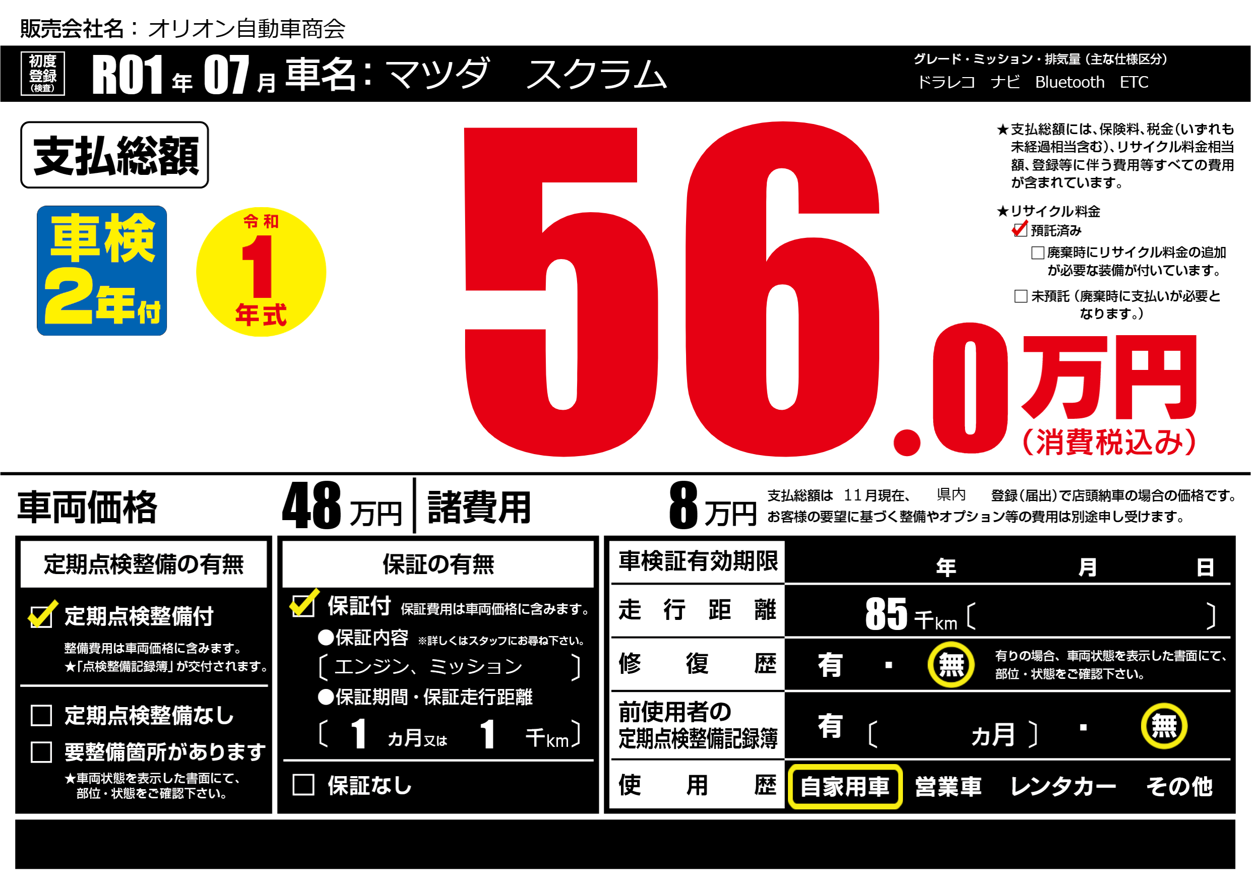 | 走行キロ | 8.5万km | 初年度登録 | R01年07月 |