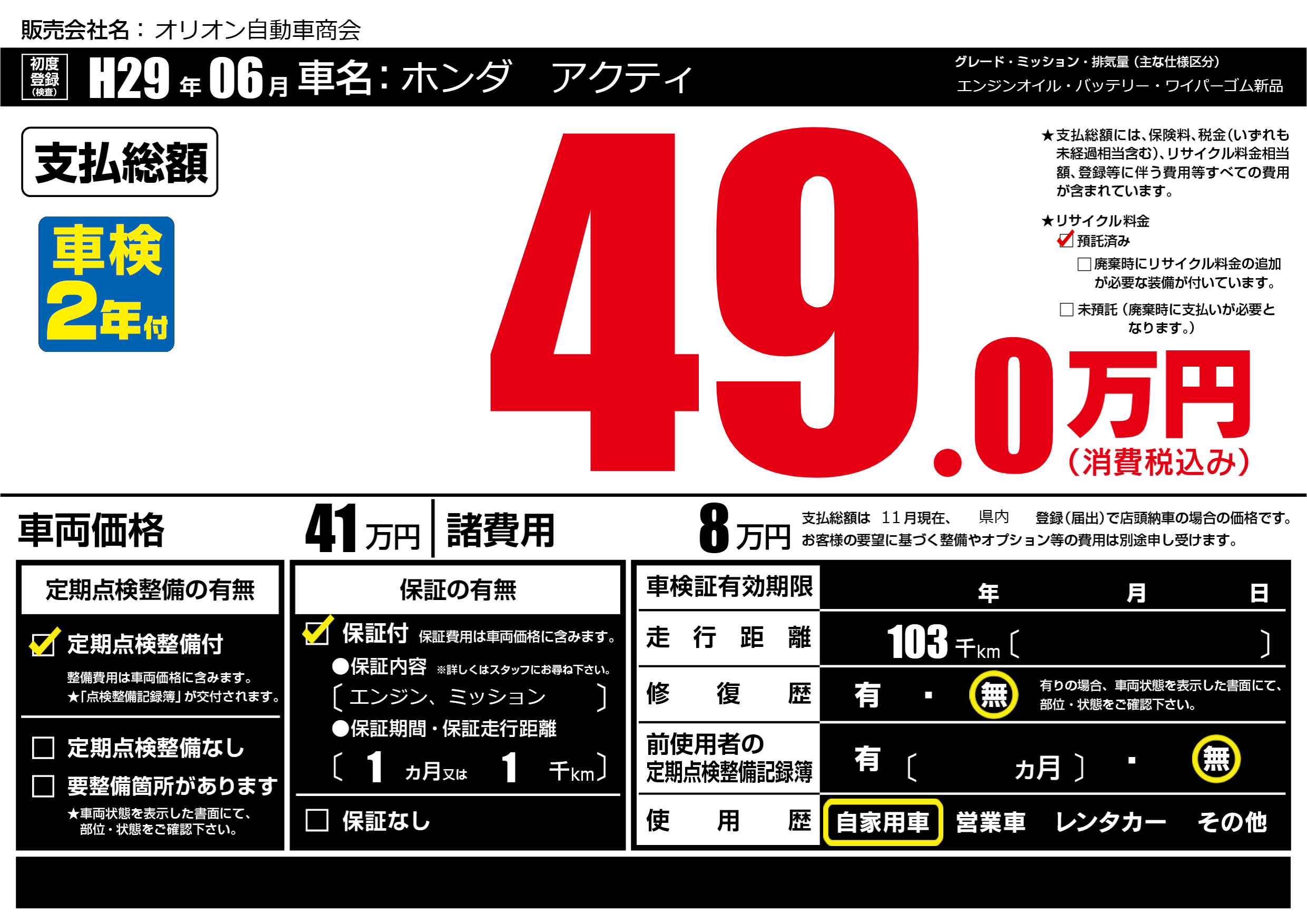 | 走行キロ | 10.3万km | 初年度登録 | H29年06月 |