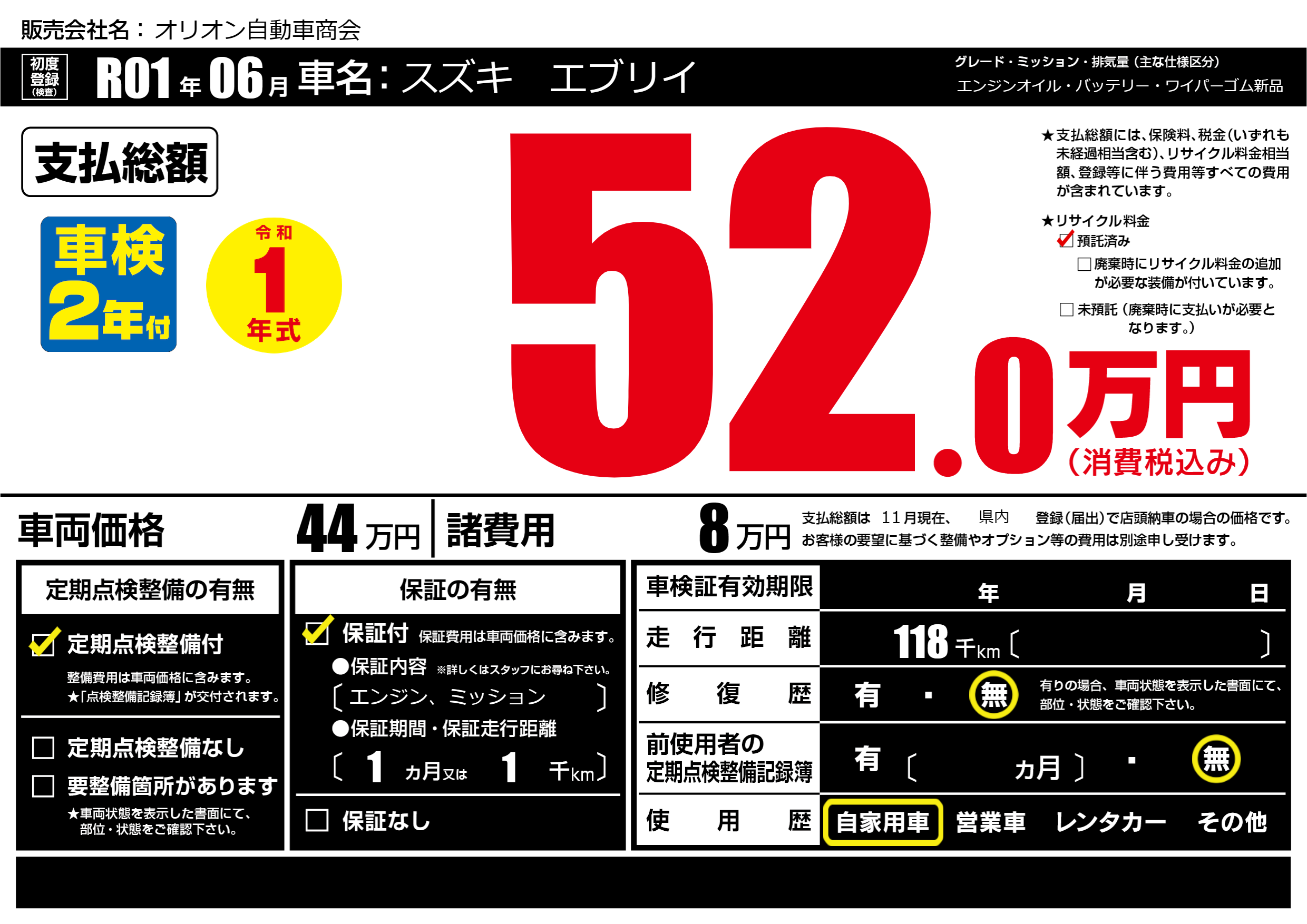 | 車名 | スズキ エブリイ | グレード ミッション 排気量 |