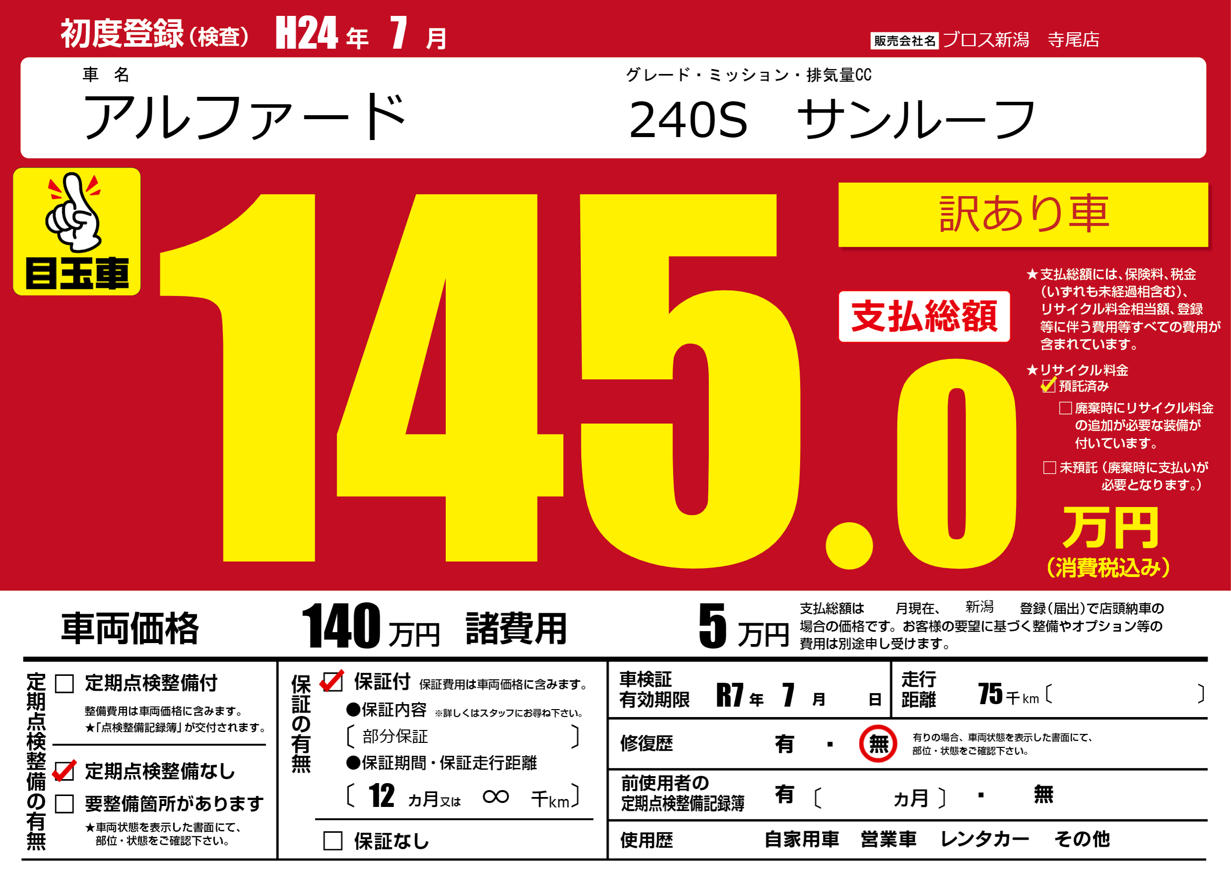 | 走行キロ | 7.5万km | 初年度登録 | H24年7月 |