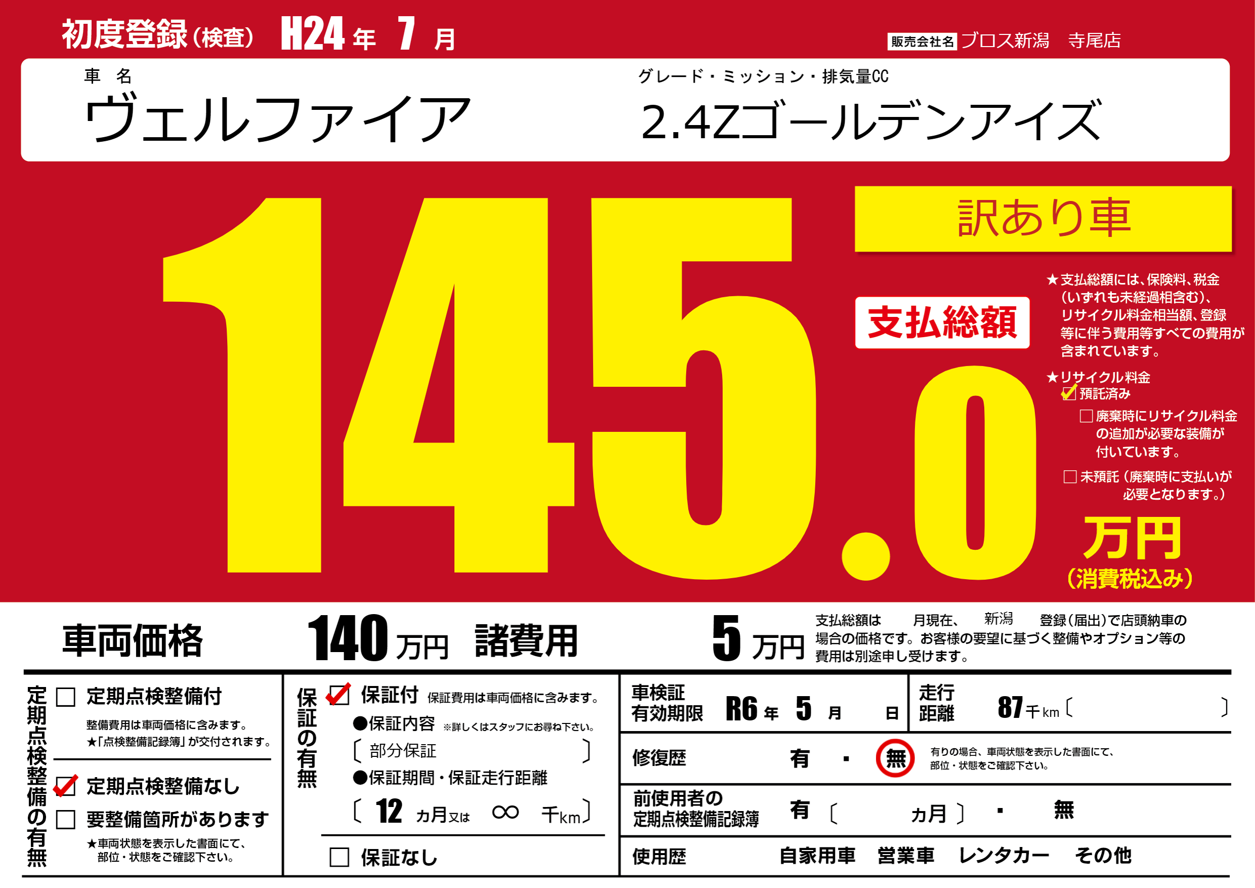 | 走行キロ | 8.7万km | 初年度登録 | H24年7月 |