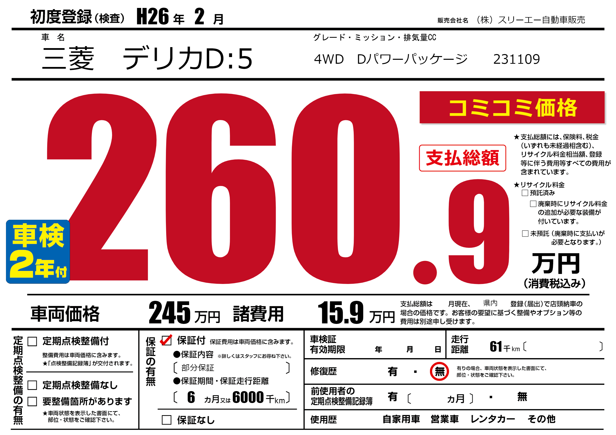 | 走行キロ | 6.1万km | 初年度登録 | H26年2月 |