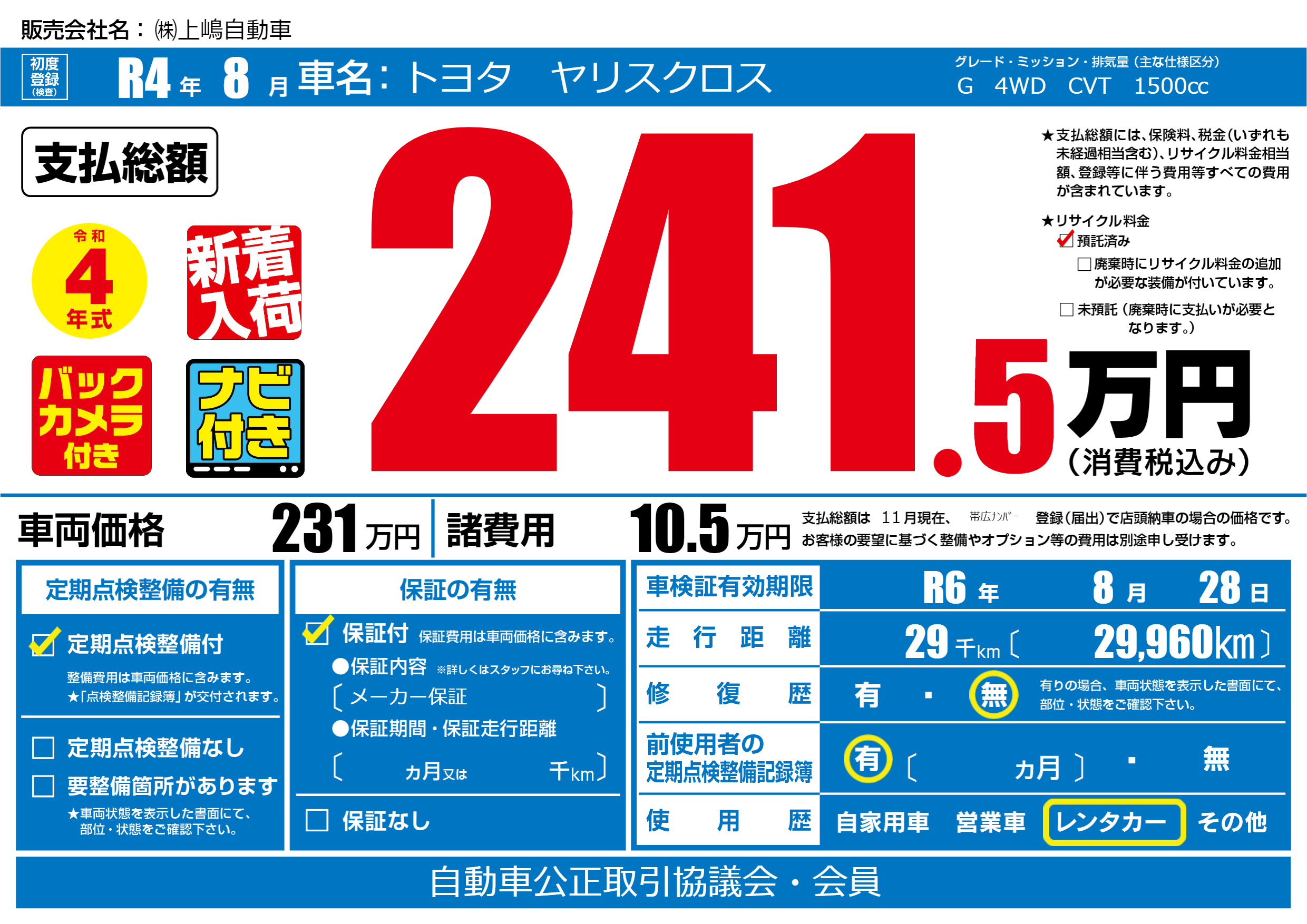 | 車名 | トヨタ ヤリスクロス | グレード ミッション 排気量 |
