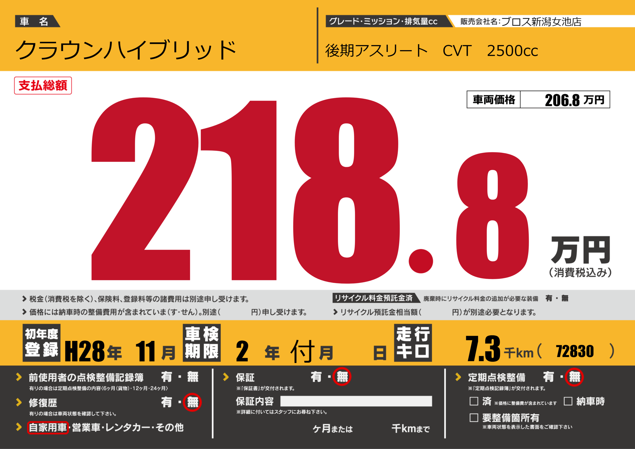 | 車名 | クラウンハイブリッド | グレード ミッション 排気量 |