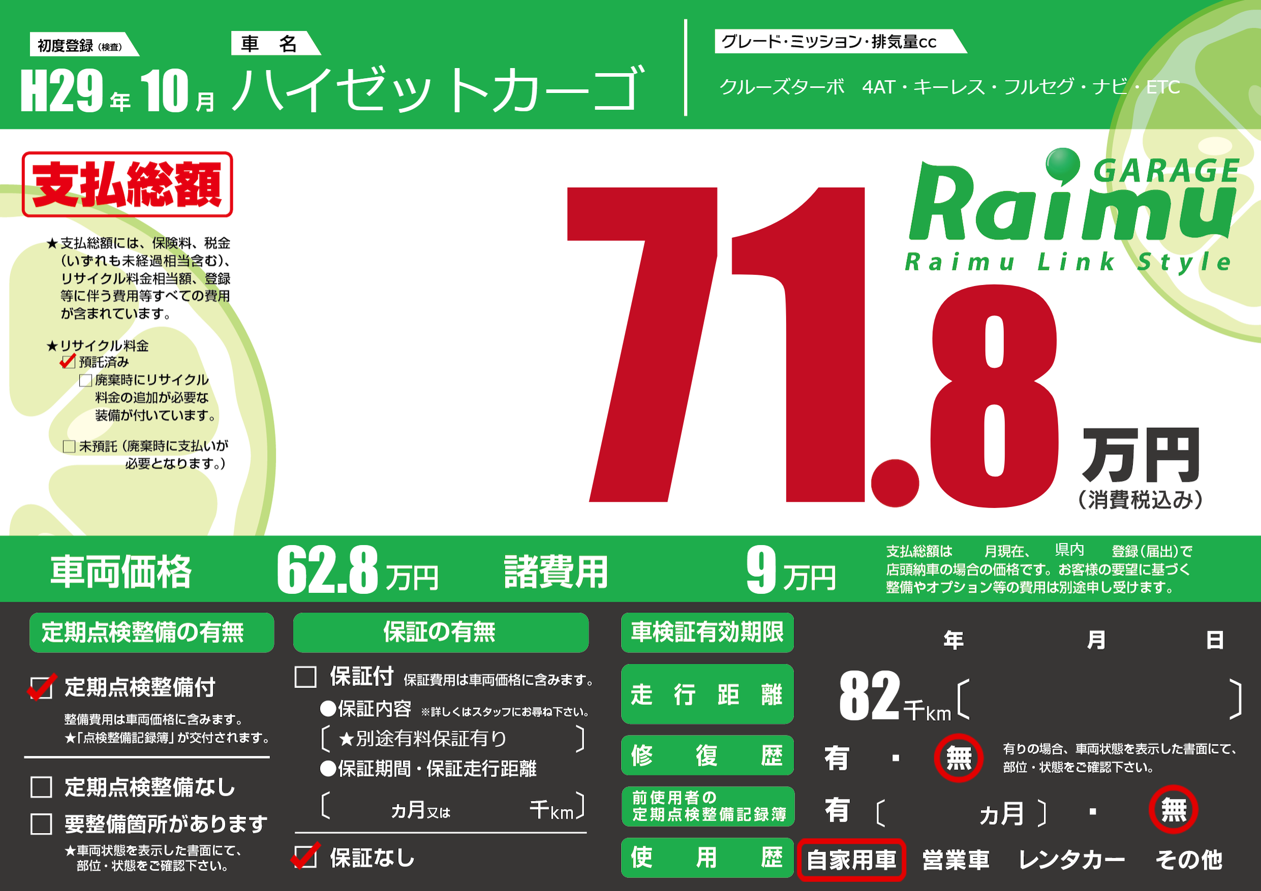 保証なし 保証内容(★別途有料保証有り) ---ヶ月または()千kmまで |