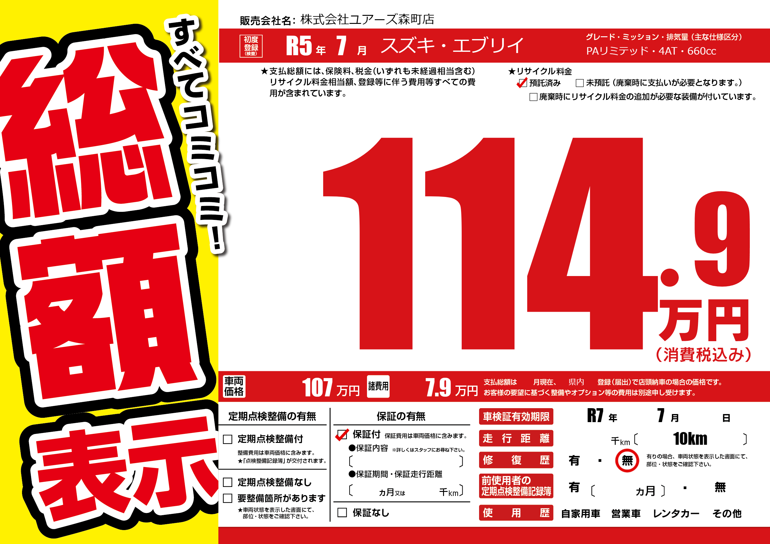 なし | 車検制限 | R7年7月---月 |
