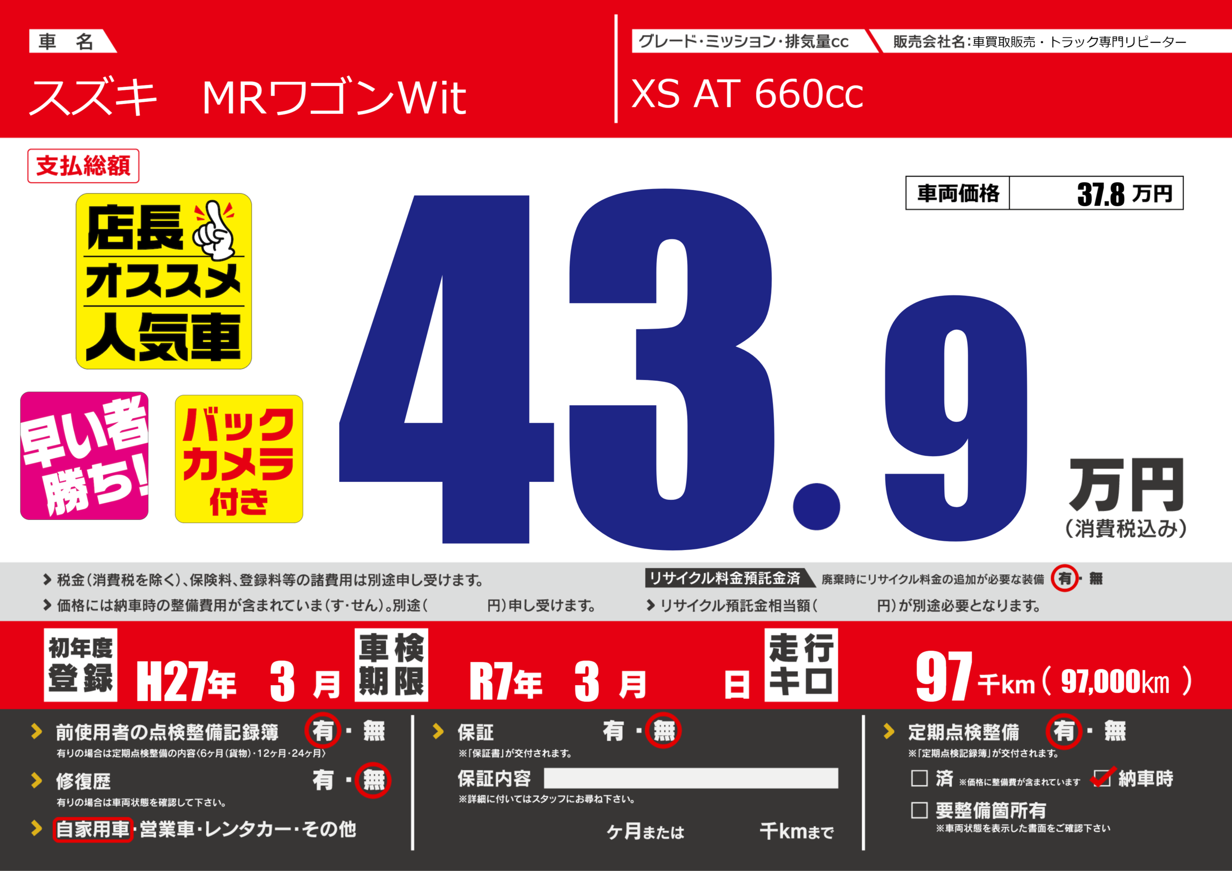 | 車検制限 | R7年 3月 - 日 | ||
