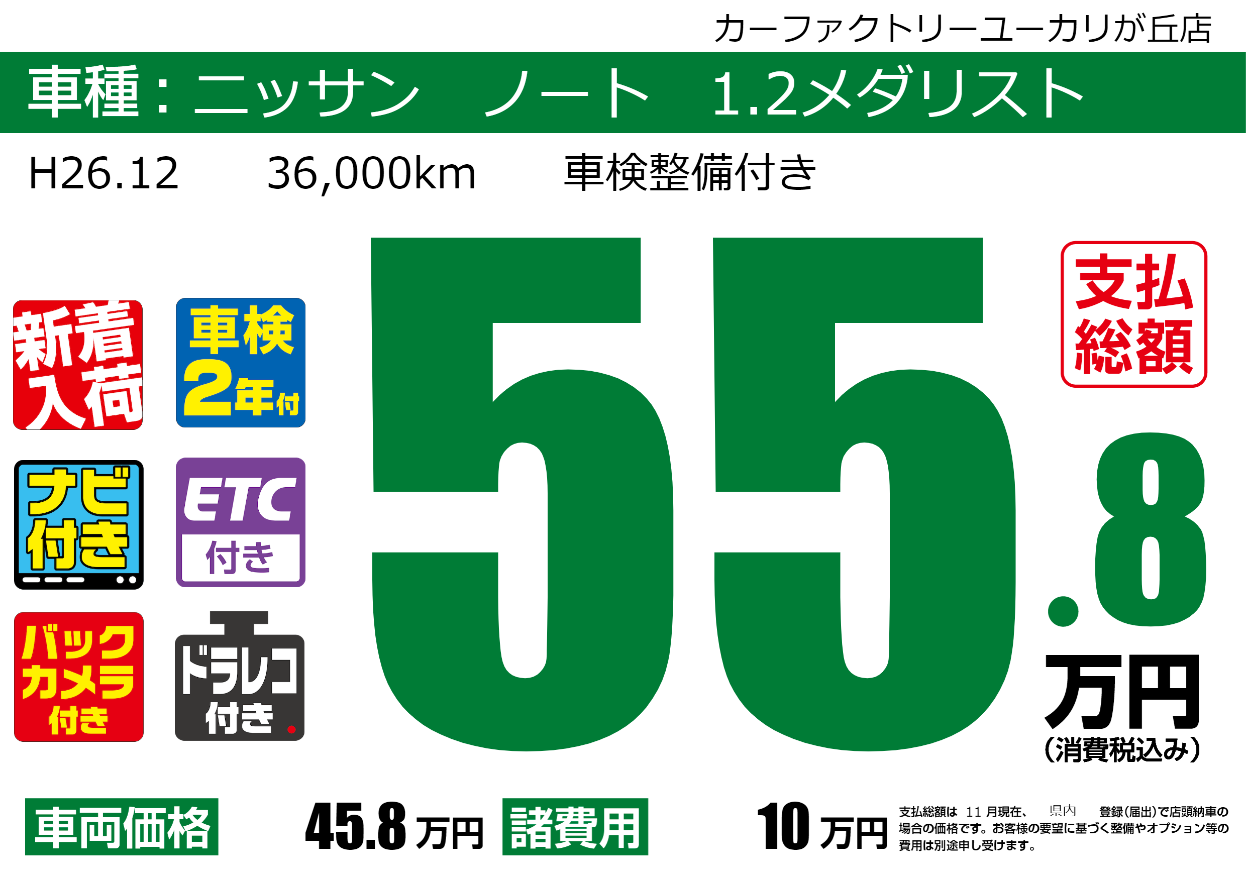 | 車名 | ニッサン ノート 1.2メダリスト | グレード ミッション 排気量 |