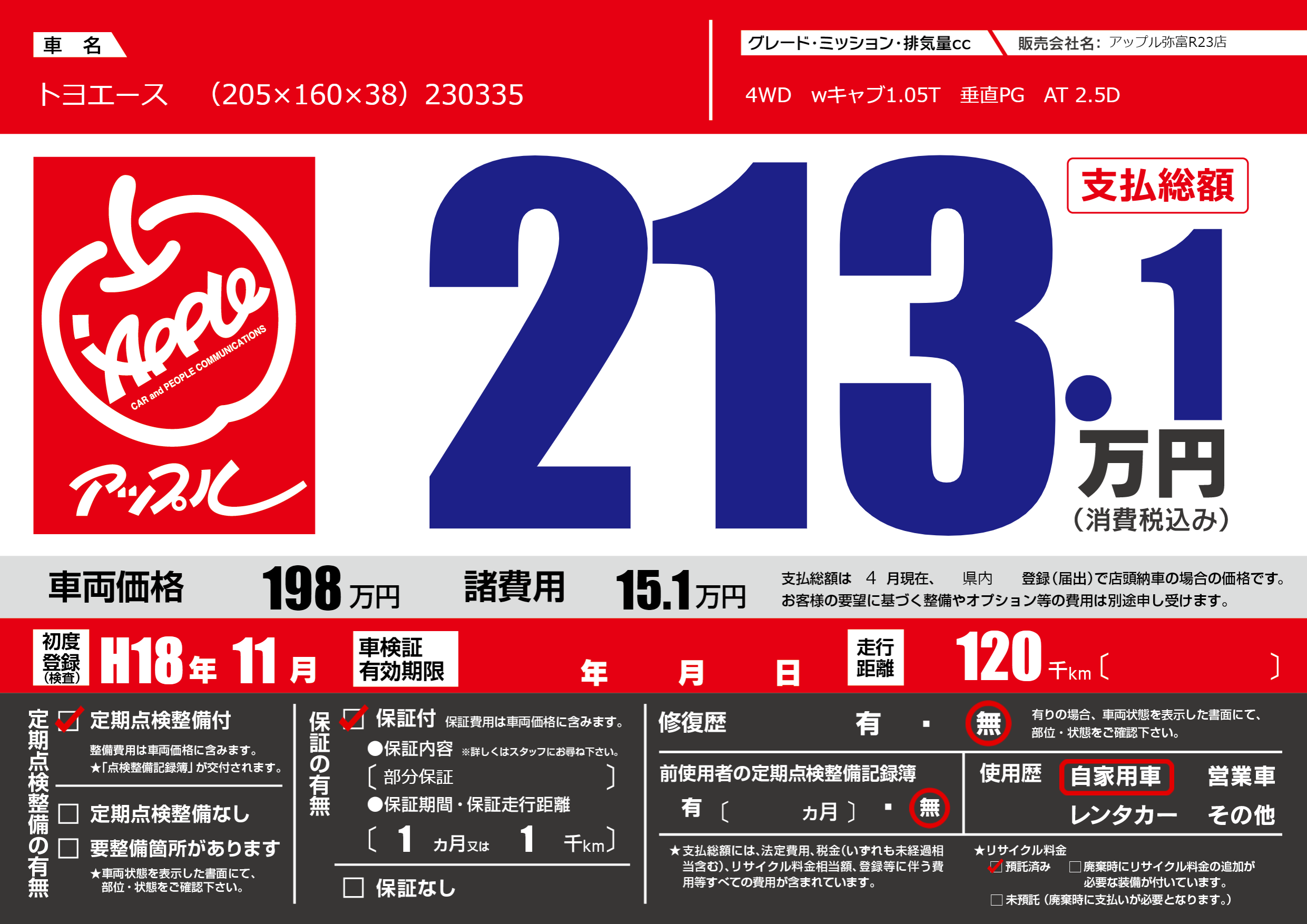 | 車名 | トヨエース (205×160×38)230335 | グレード ミッション 排気量 |