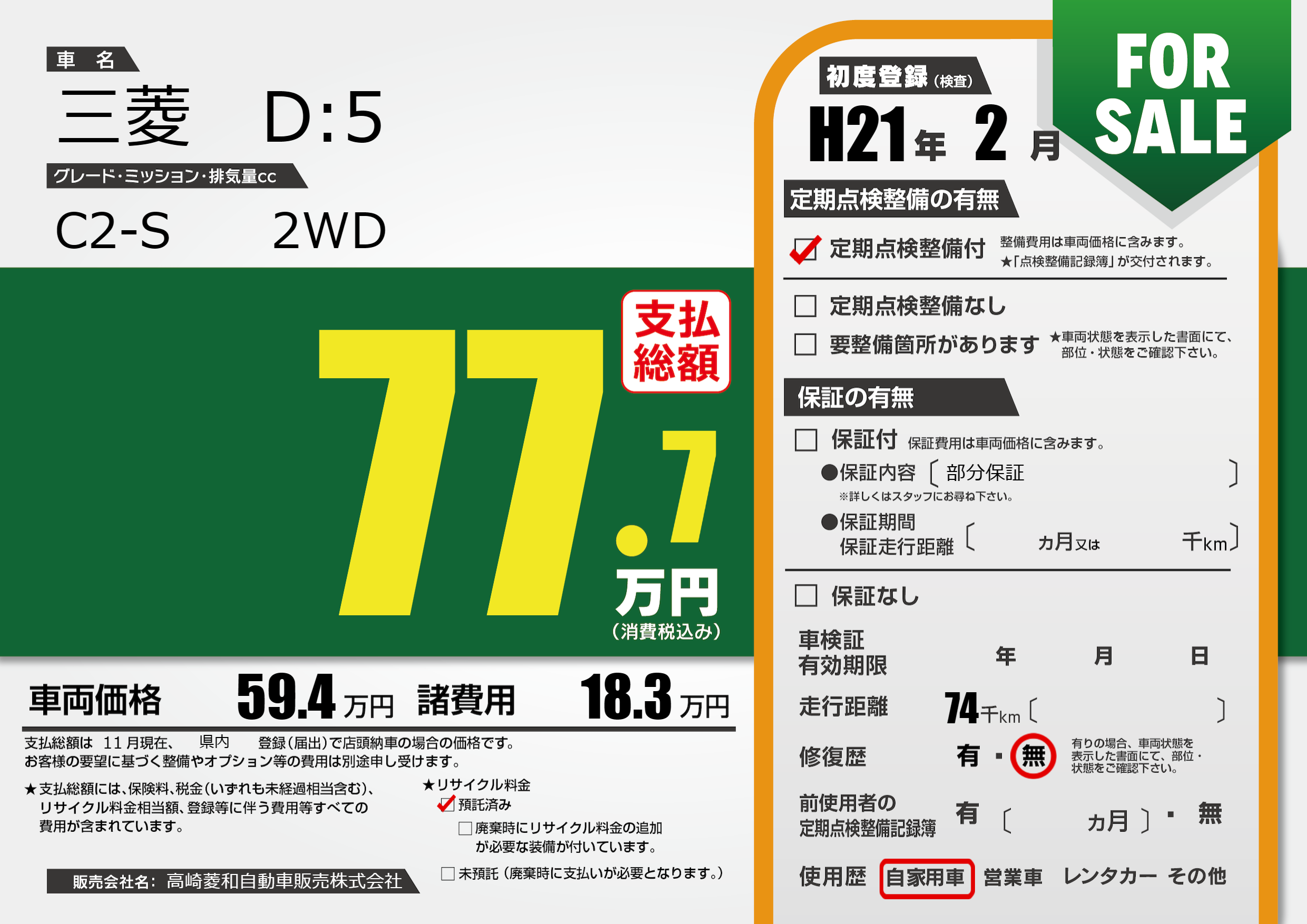 | 車名 | 三菱 D:5 | グレード ミッション 排気量 |