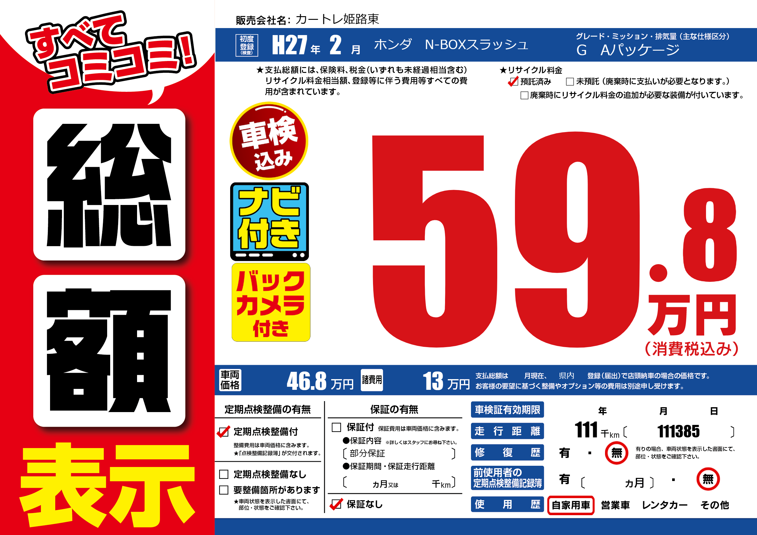 | 車名 | ホンダ N-BOXスラッシュ | グレード ミッション 排気量 |