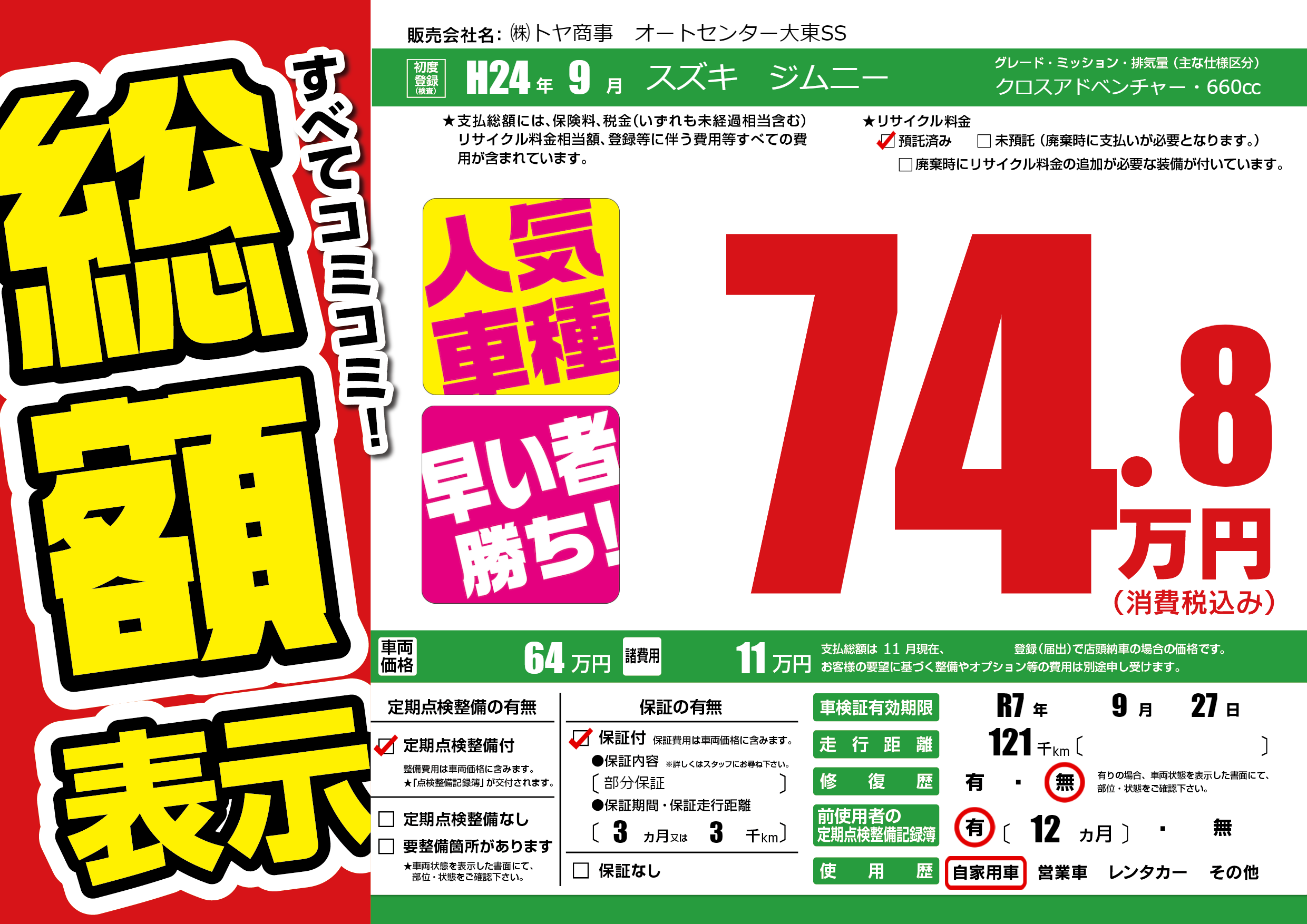 | 走行キロ | 12.1万km | 初年度登録 | H24年9月 |